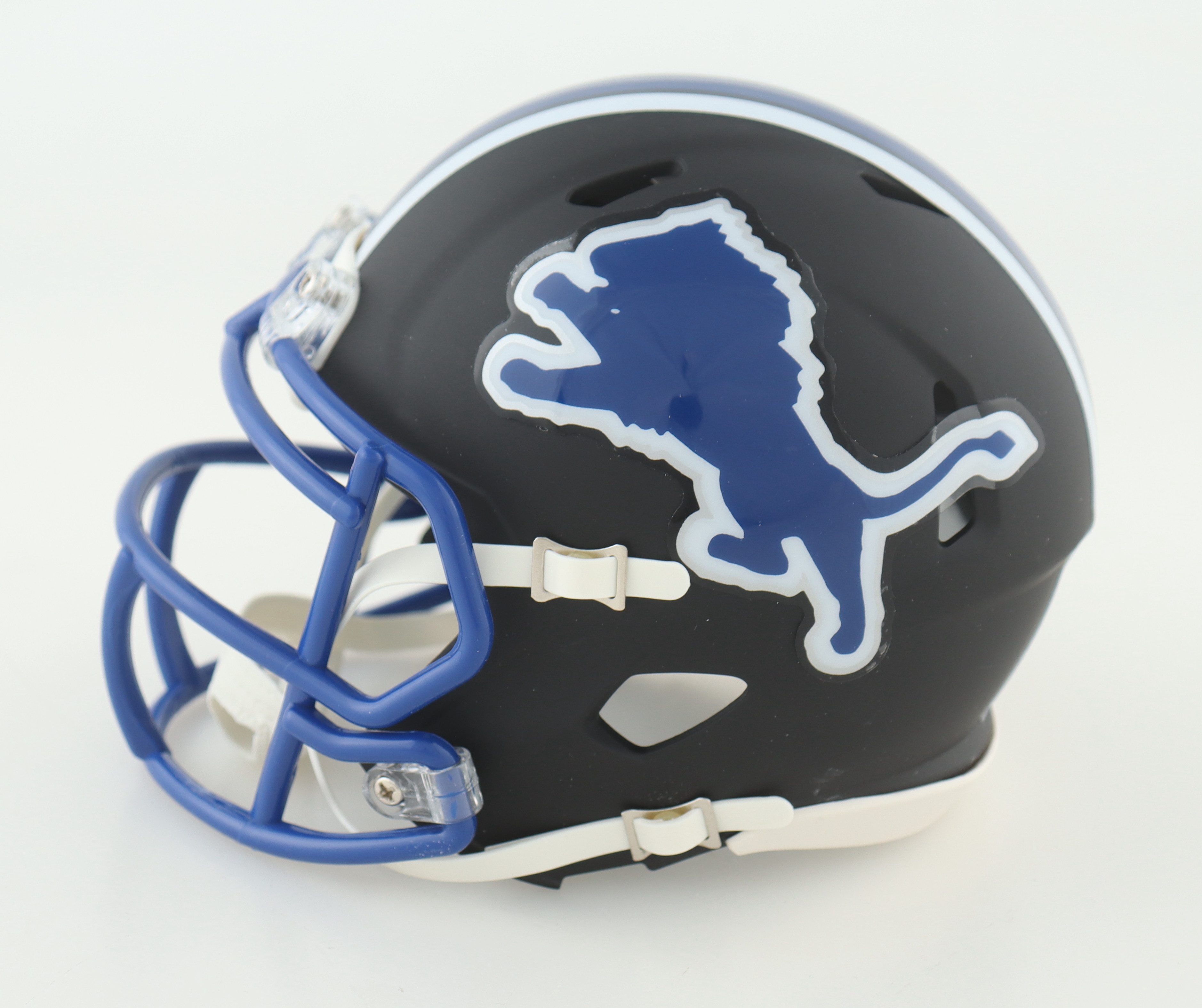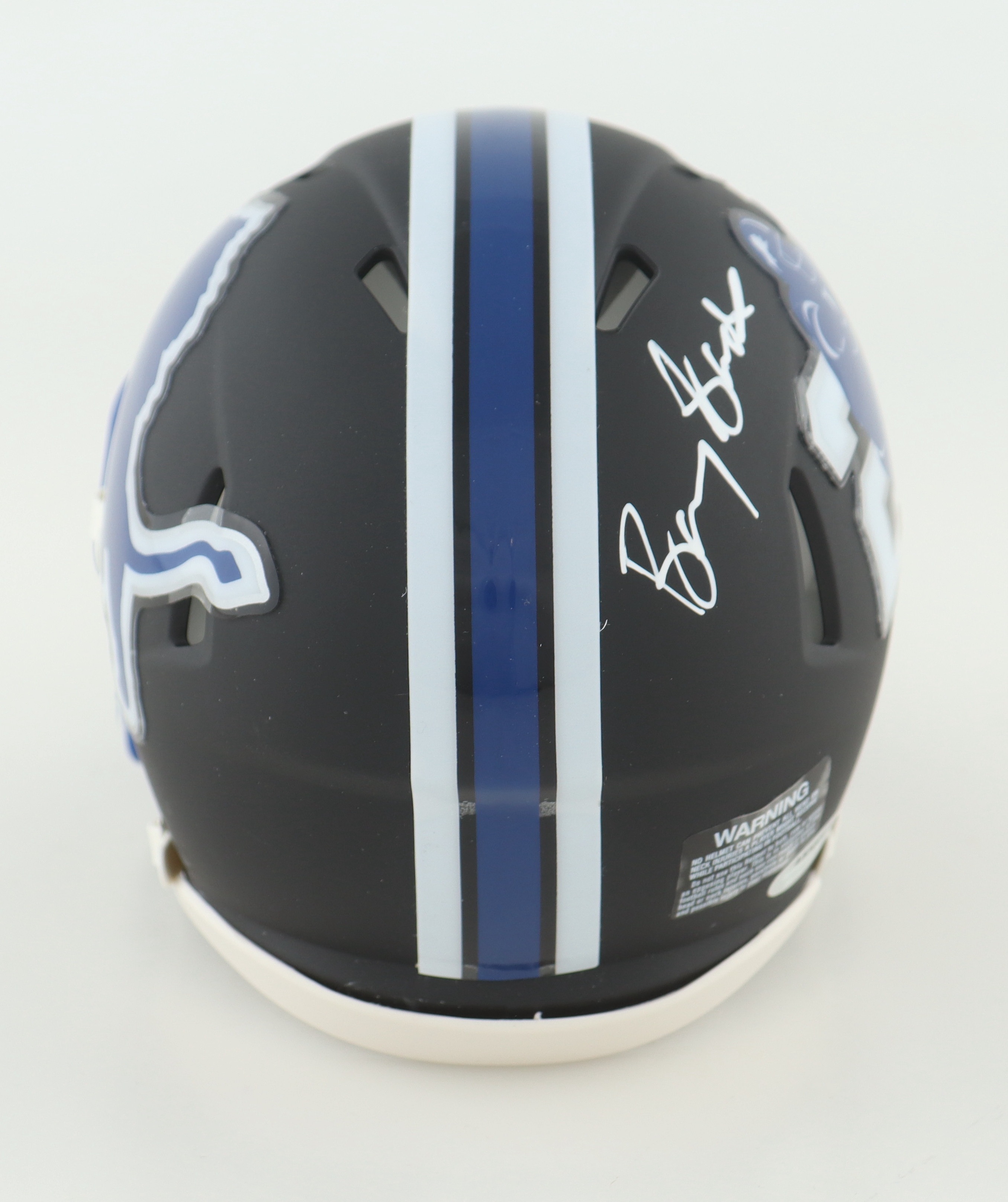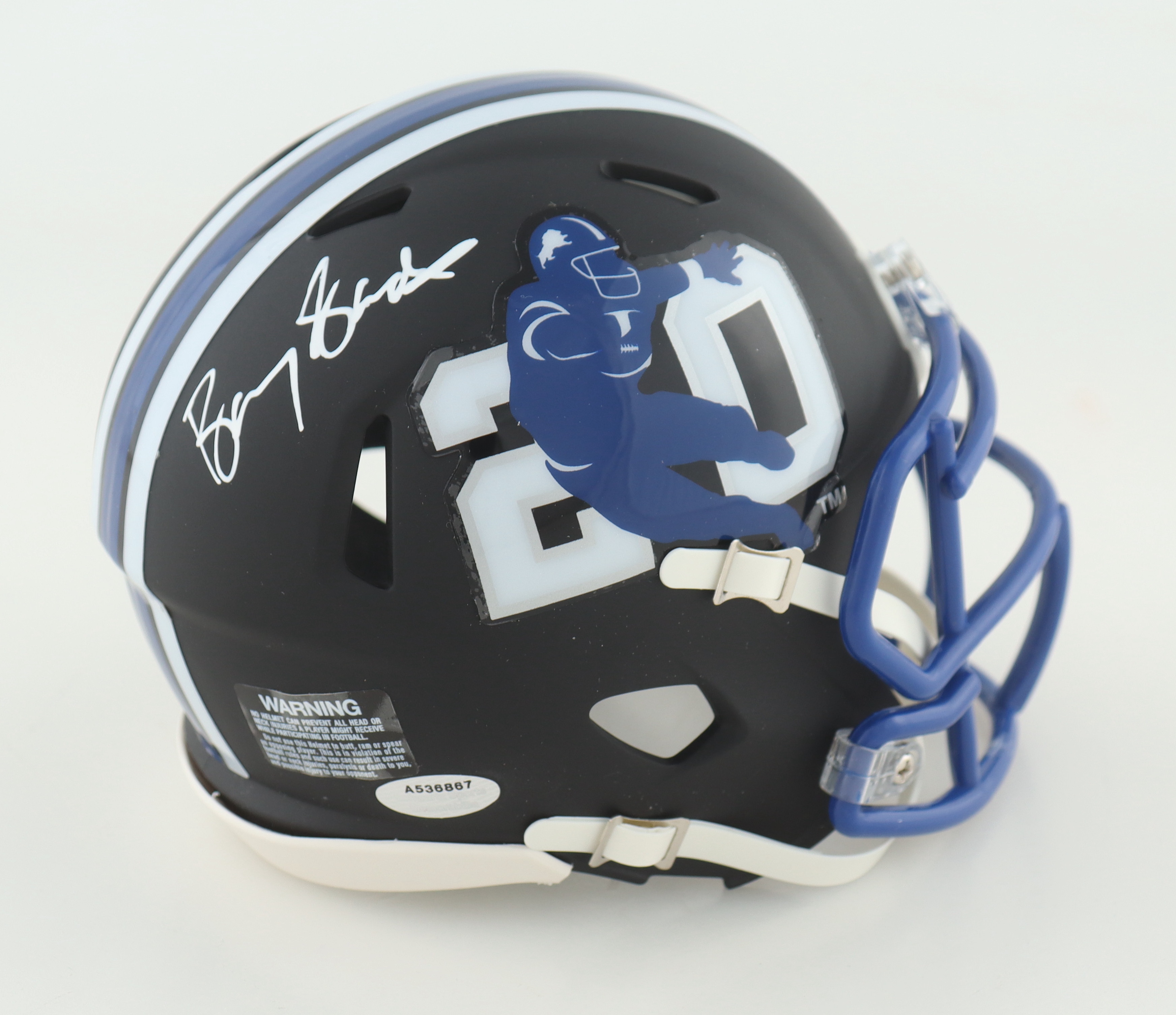 Riddell Barry Sanders logo speed mini helmet. Hand-signed by Barry Sanders (HOF).