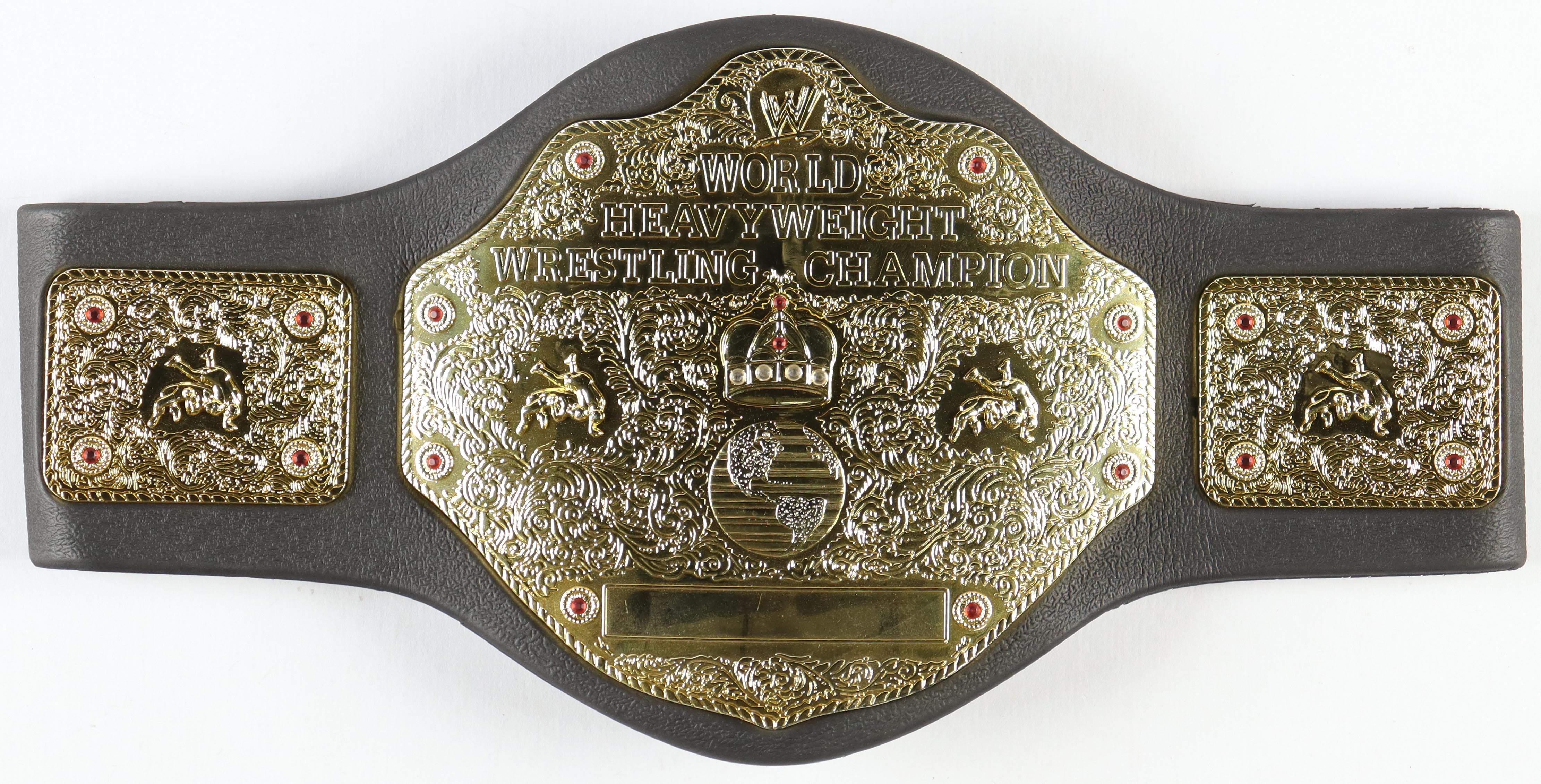 Replica toy WWE Heavyweight Championship retro belt measures approximately 38"in length and has been hand-signed and inscribed by Bill Goldberg.