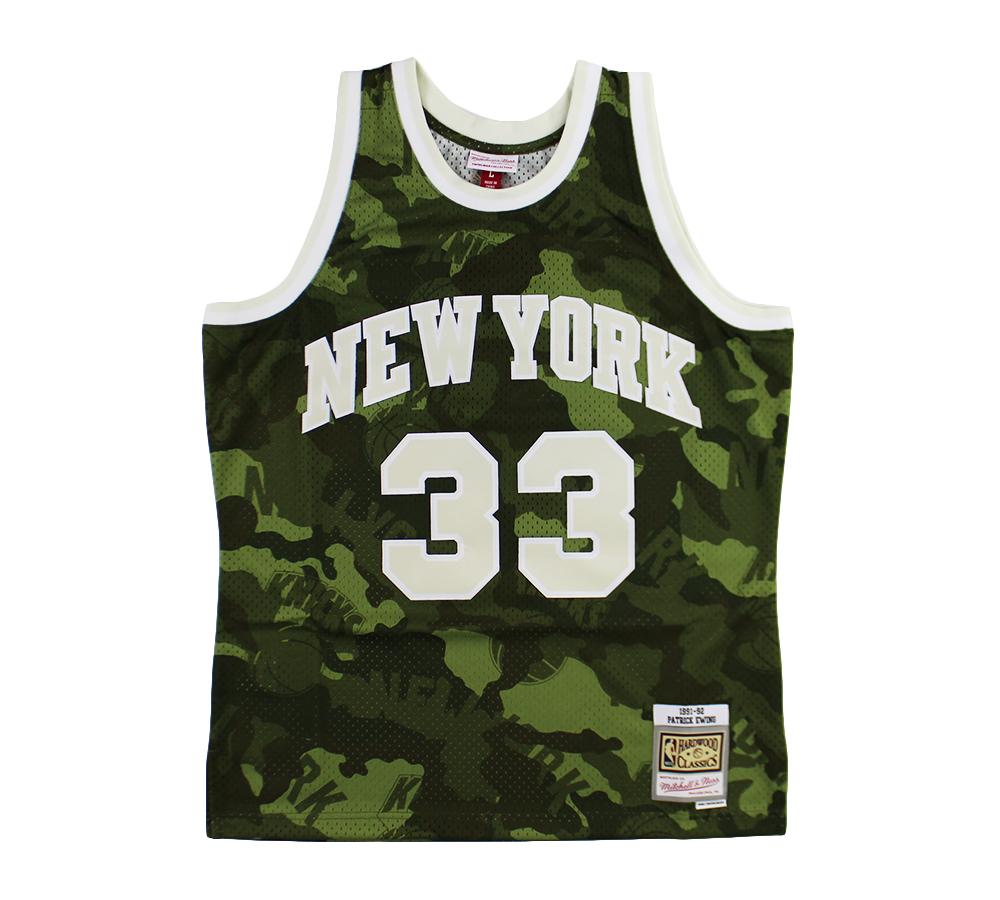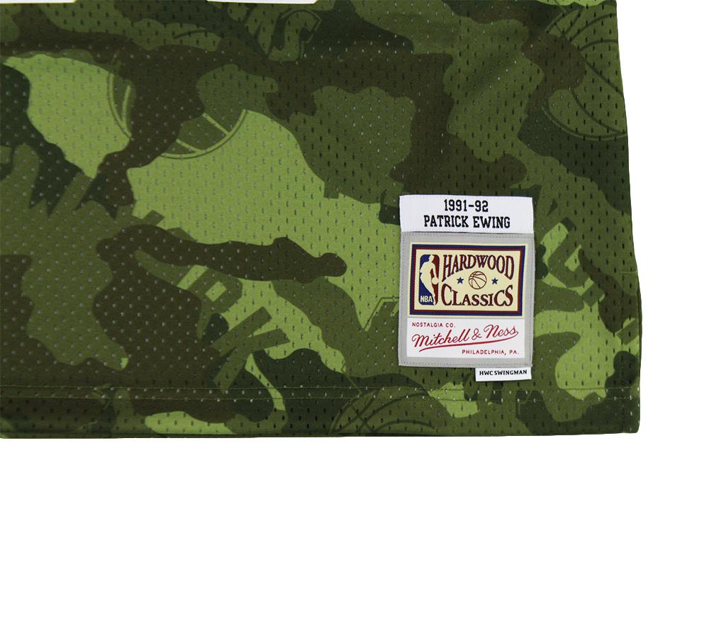 Mitchell & Ness Swingman Ghost Green Camo jersey. Everything sewn on, size L. Hand-signed by Patrick Ewing (New York Knicks, HOF).