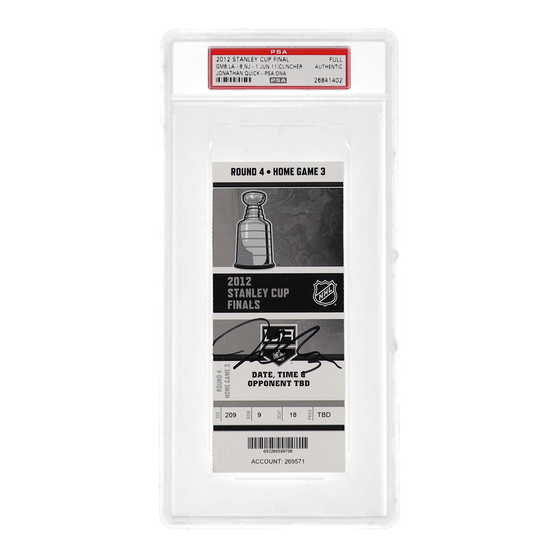 Jonathan Quick Signed 2012 Stanley Cup Final Ticket (PSA)