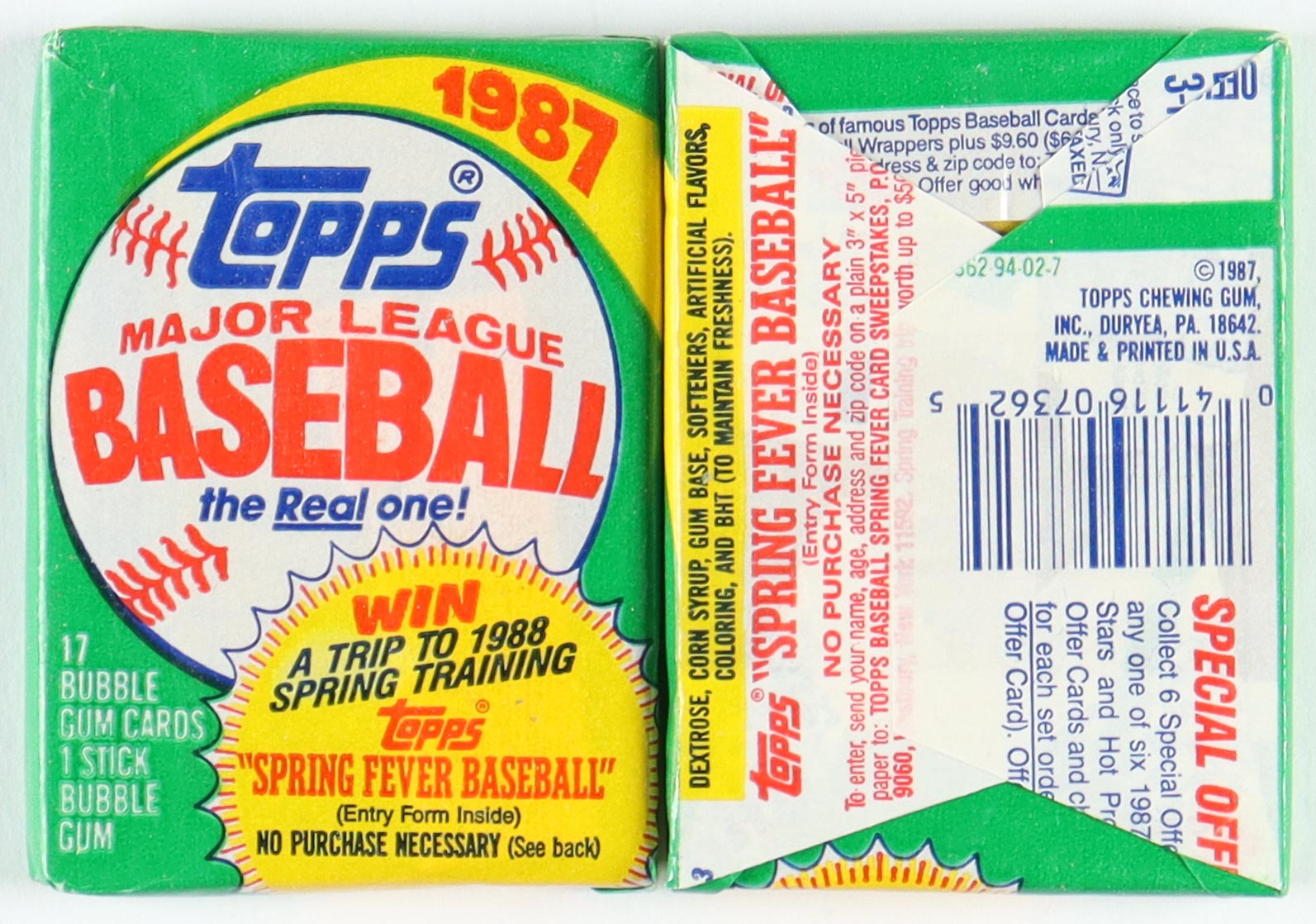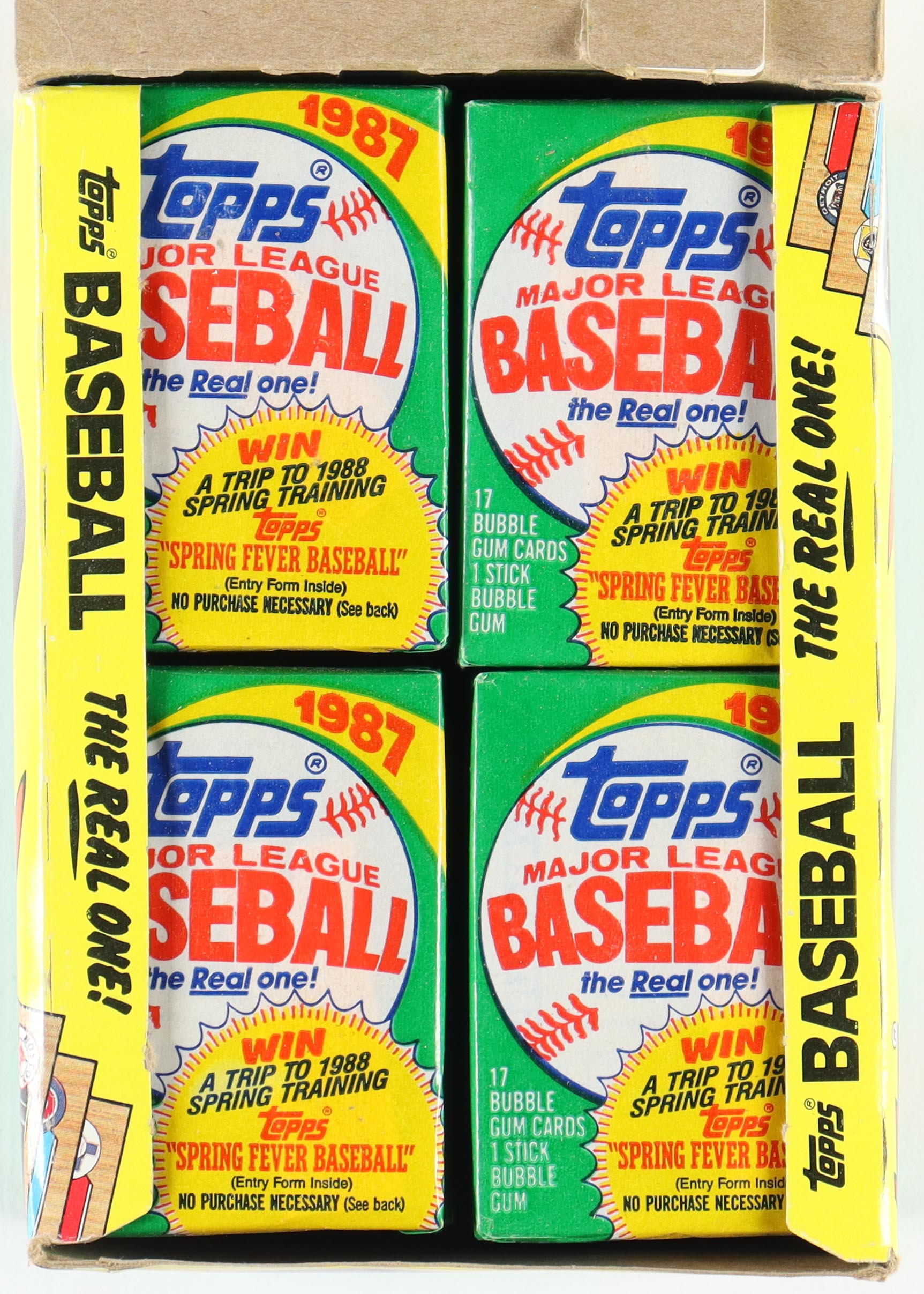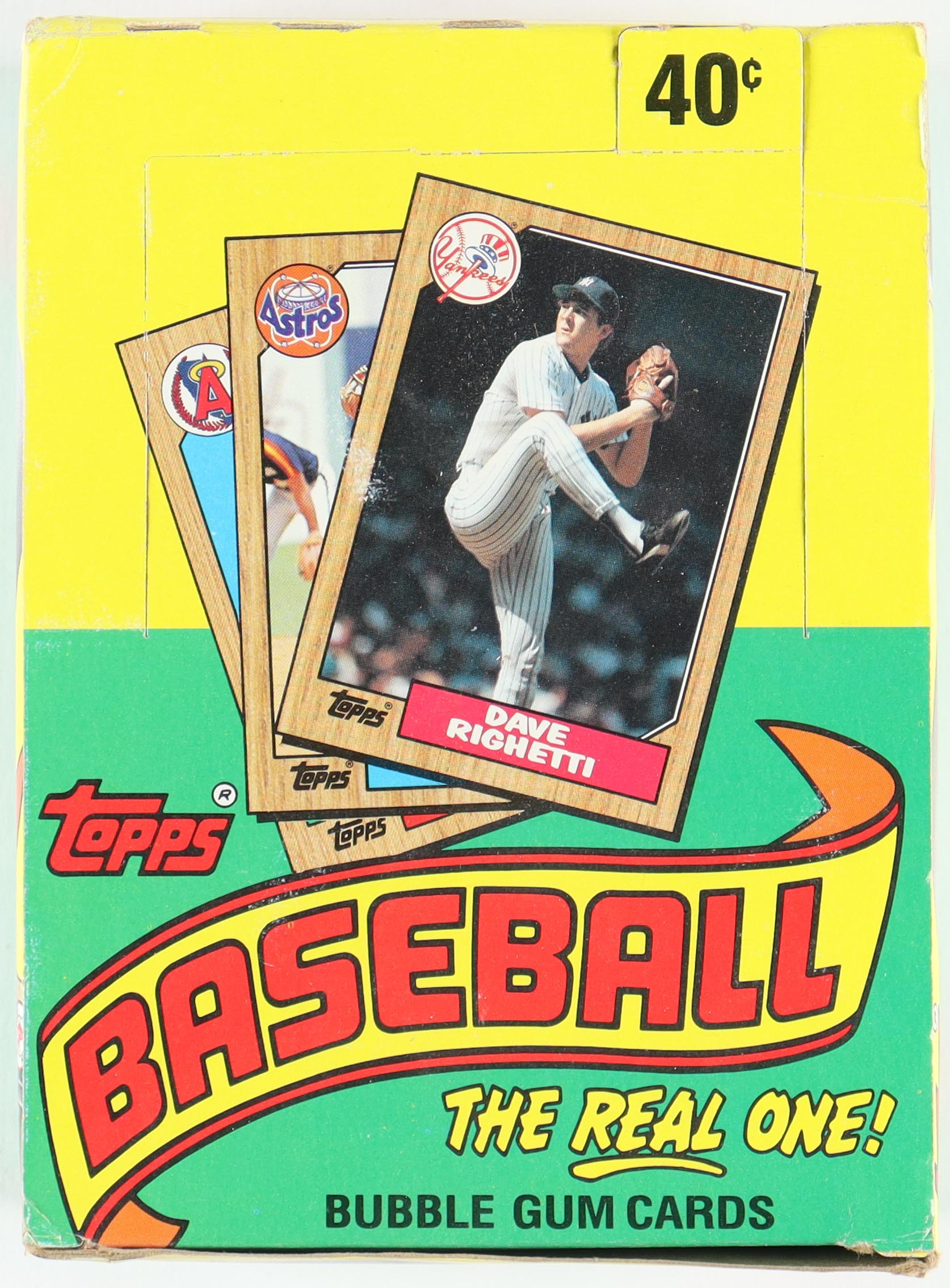 1987 Topps "The Real One" Bubble Gum Baseball Card Box. Box includes (36) packs, (17) cards and (1) bubble gum stick per pack. Please see photos for more details regarding the condition of the box.