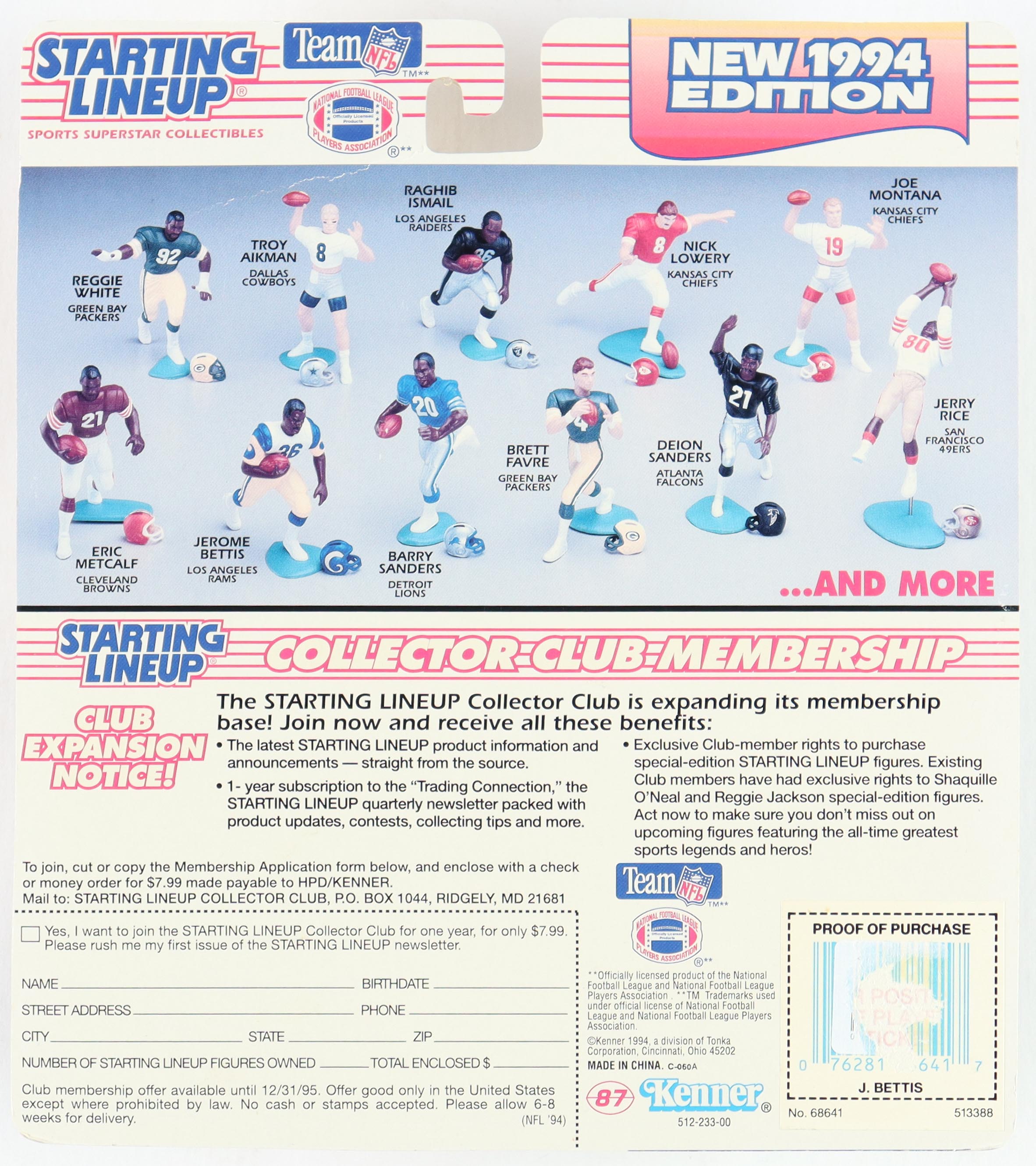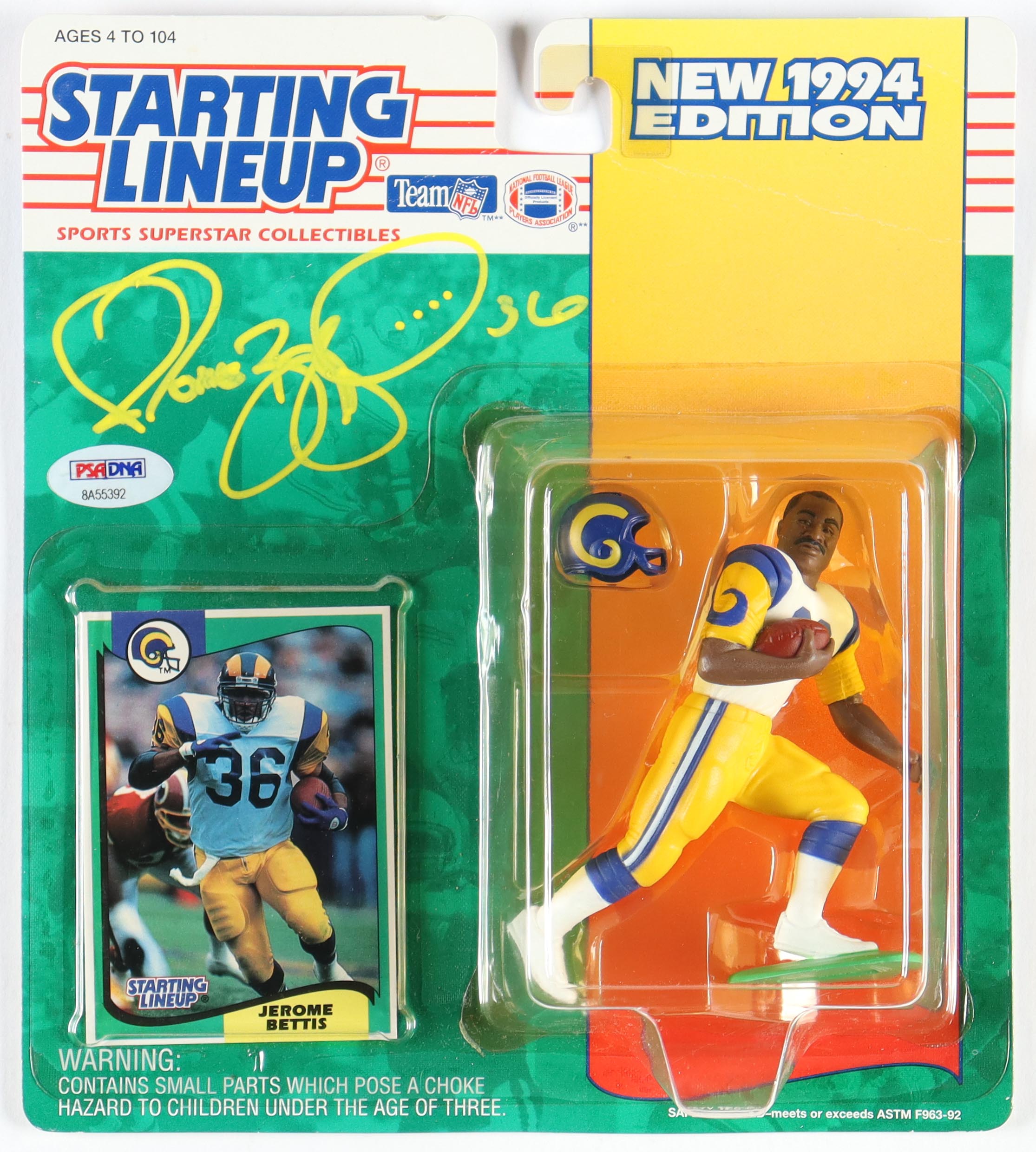 Factory sealed Starting Lineups 1995 Figure measures 4" in size and includes a 1995 Kenne Starting Lineup Cards #2 trading card. Hand-signed on the packaging by Jerome Bettis (St. Louis Rams, HOF).