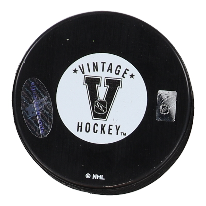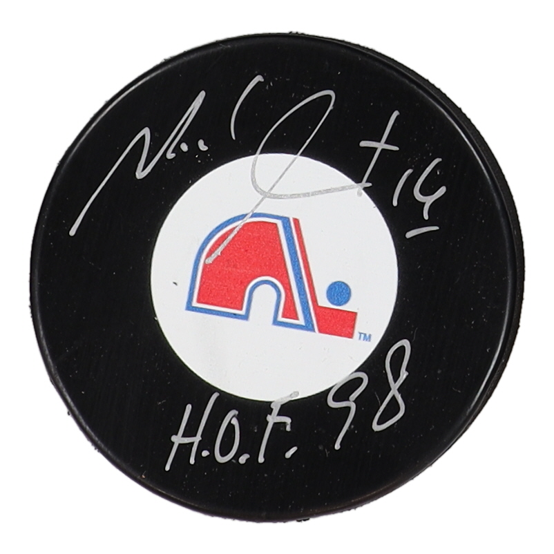 Quebec Nordiques logo hockey puck. Hand-signed and inscribed by Michel Goulet (Quebec Nordiques, HOF). Please refer to photos for condition of the puck.