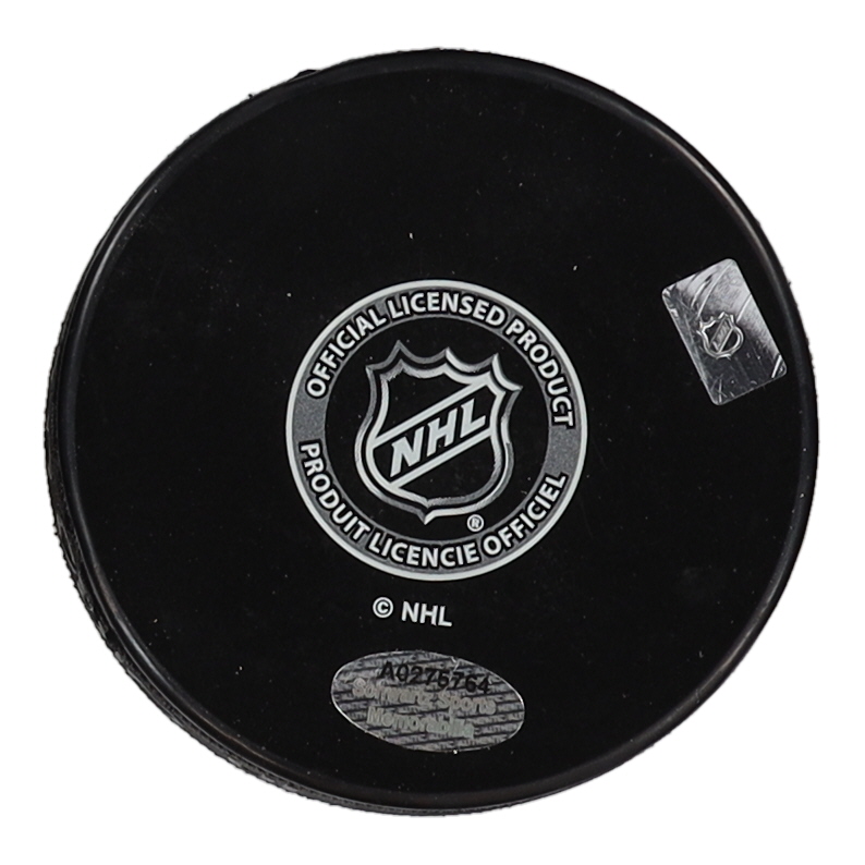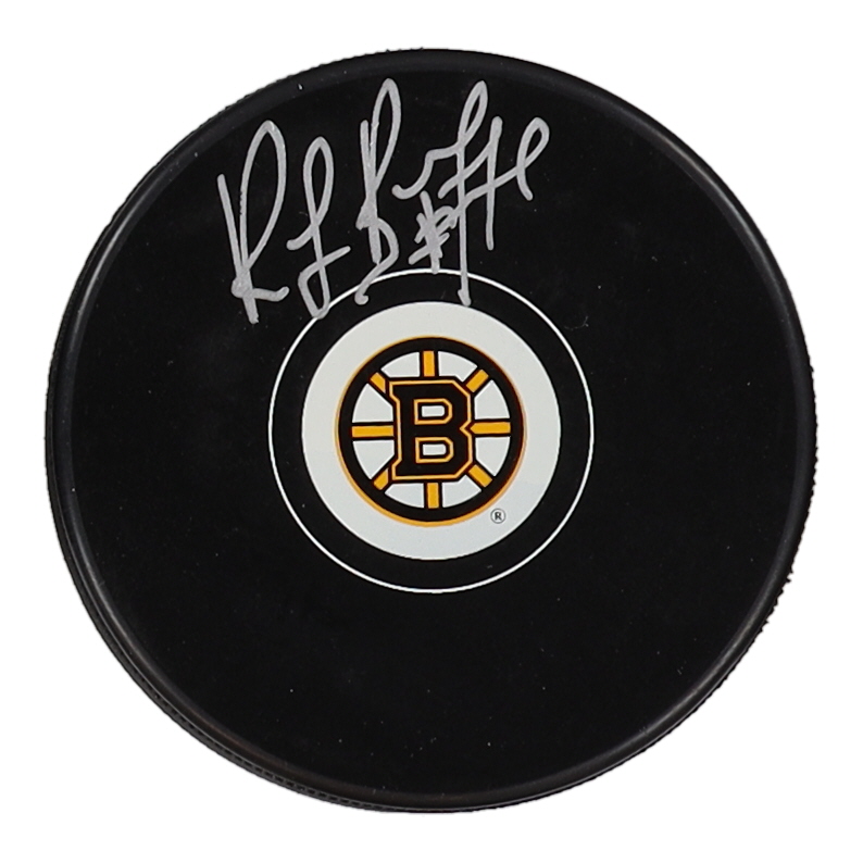 Boston Bruins logo hockey puck. Hand-signed by Ray Bourque (HOF).