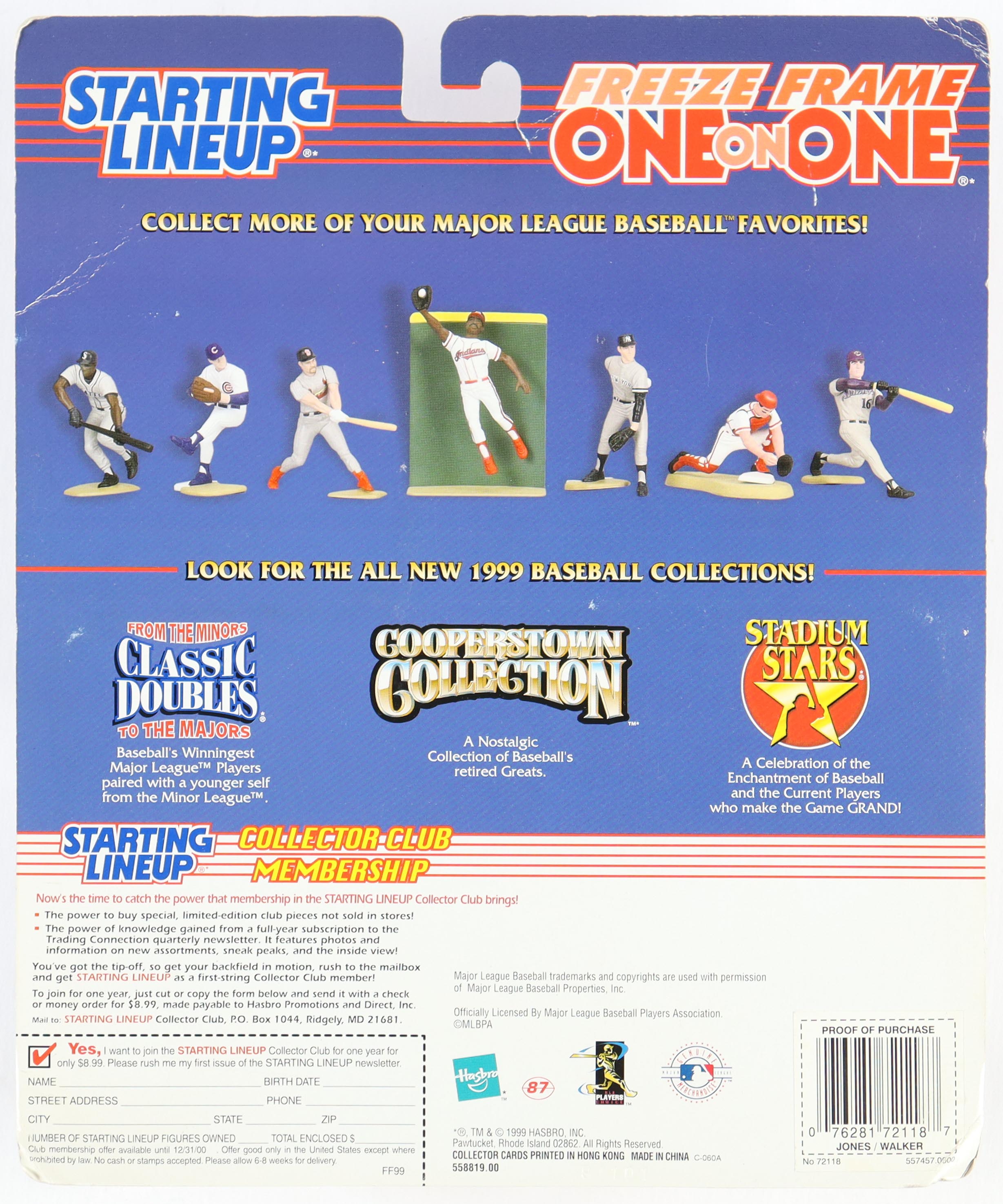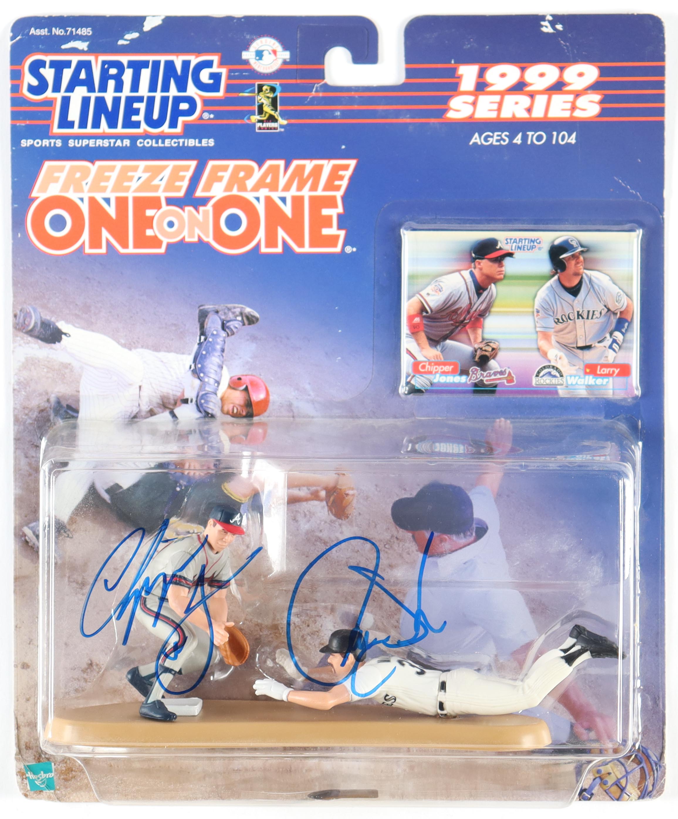 1999 Extended Series Starting Lineup action figure has been hand-signed on the original packaging by Chipper Jones (Atlanta Braves, HOF) and Larry Walker (Colorado Rockies, HOF). Action figure also comes with (1) 1999 Hasbro Starting Lineup card.
