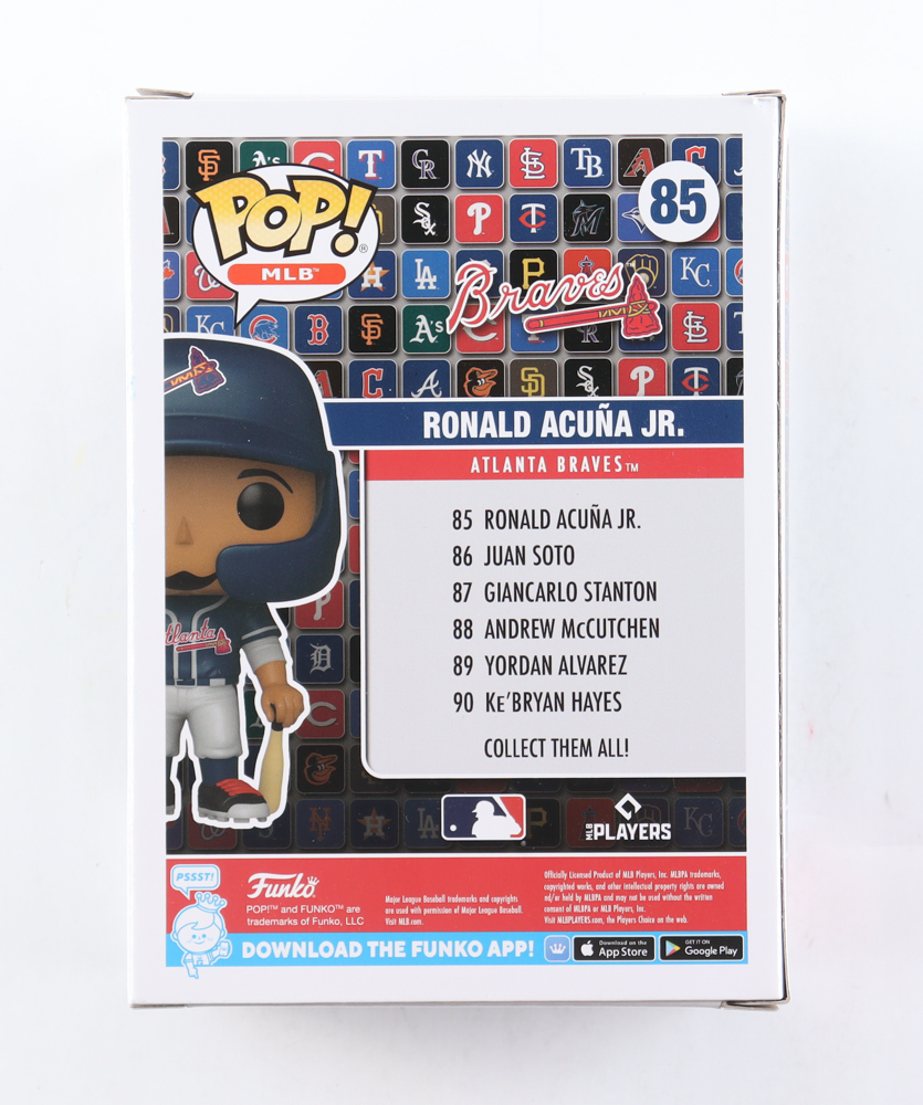 Funko Pop! figure measures approximately 4" tall and has been hand-signed on the packaging by Ronald Acuna Jr. (Atlanta Braves).