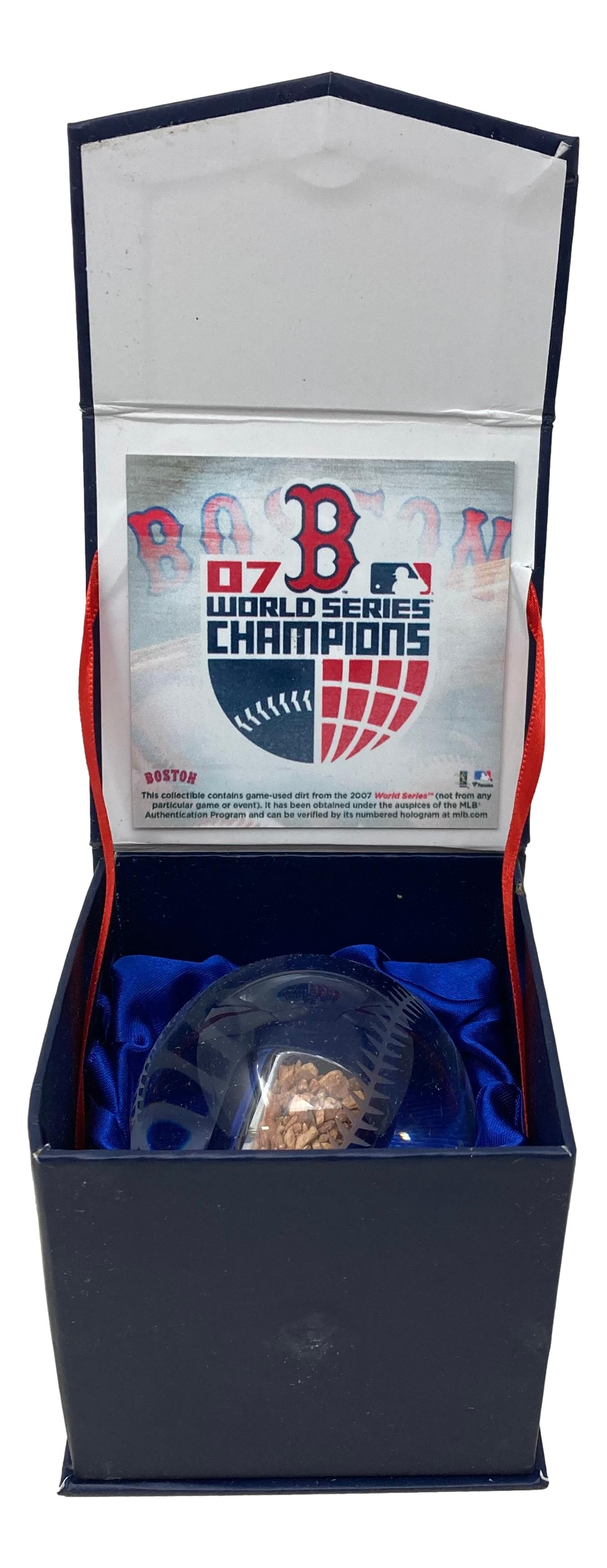 Featured is a 2007 World Series Champions Boston Red Sox crystal baseball w/ game used dirt. This ball comes with the MLB hologram adhered to the bottom for authenticity purposes. This ball would make a great addition to any sports memorabilia collection!