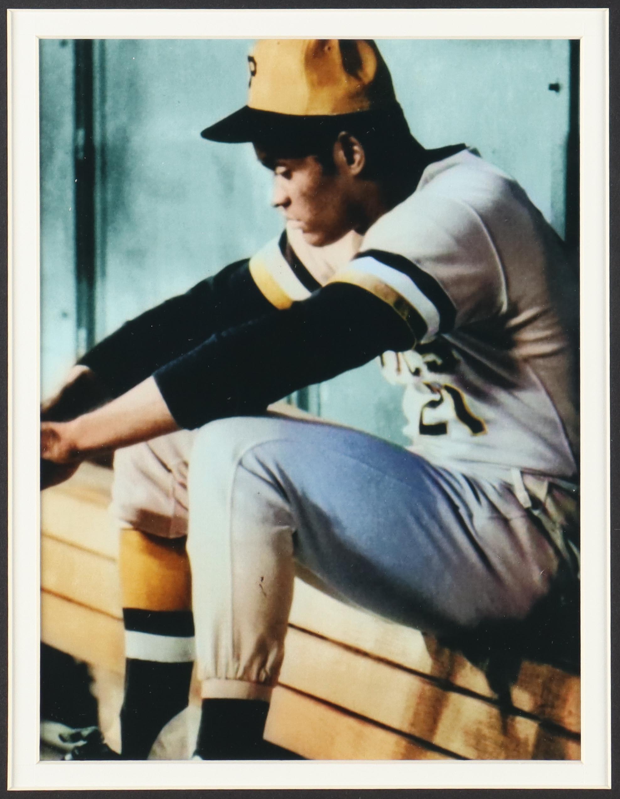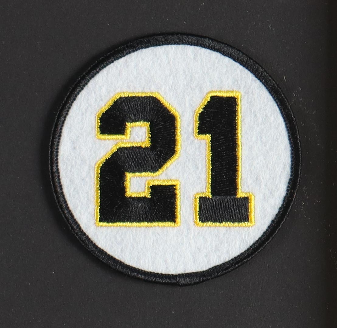 Custom framed jersey display measures approximately 33" x 37" in size and features an unsigned Roberto Clemente (D. 1972) jersey. The display also includes a 1960's Champions and Vintage Hall Of Fame Pirates Pins. Please note, the jersey is unsigned.