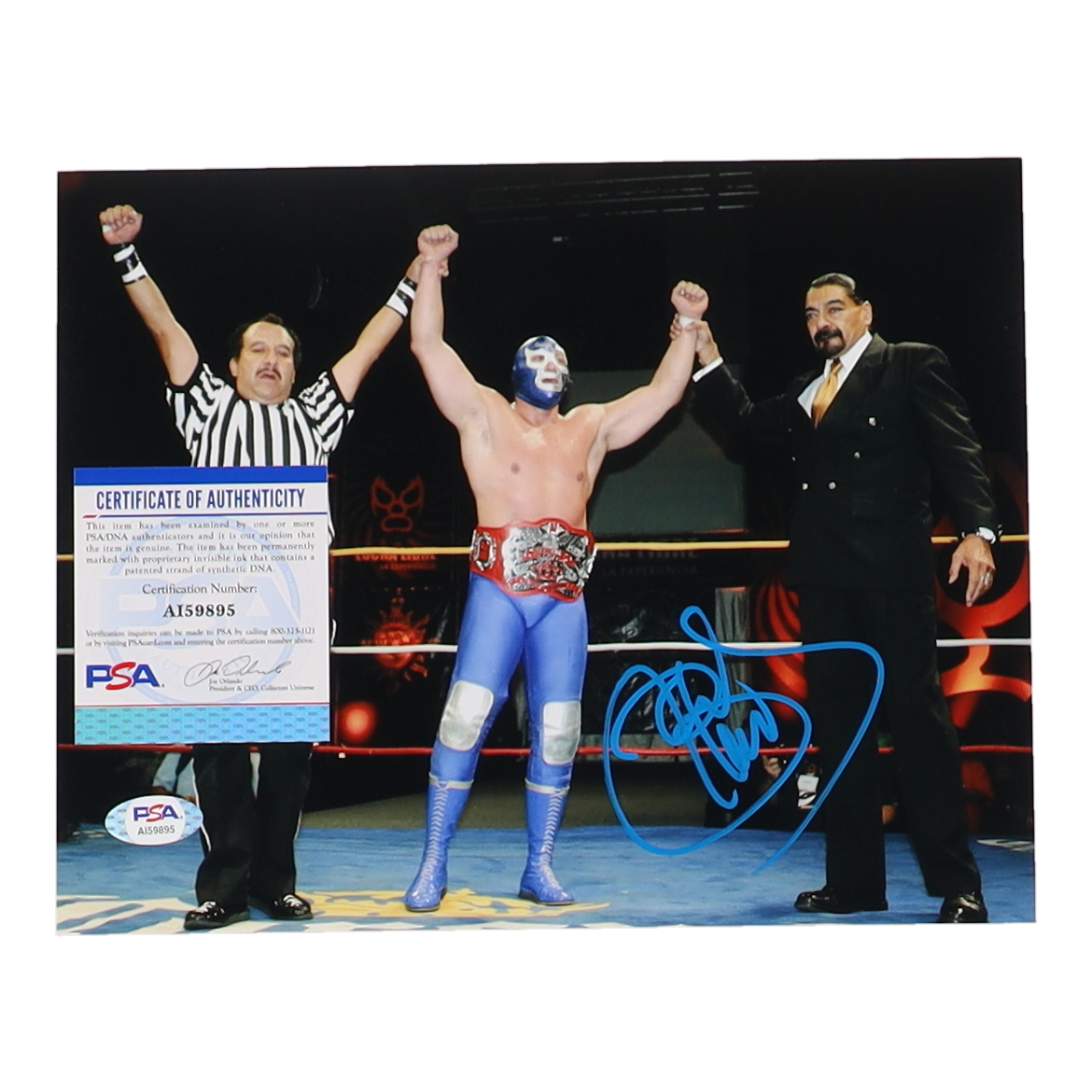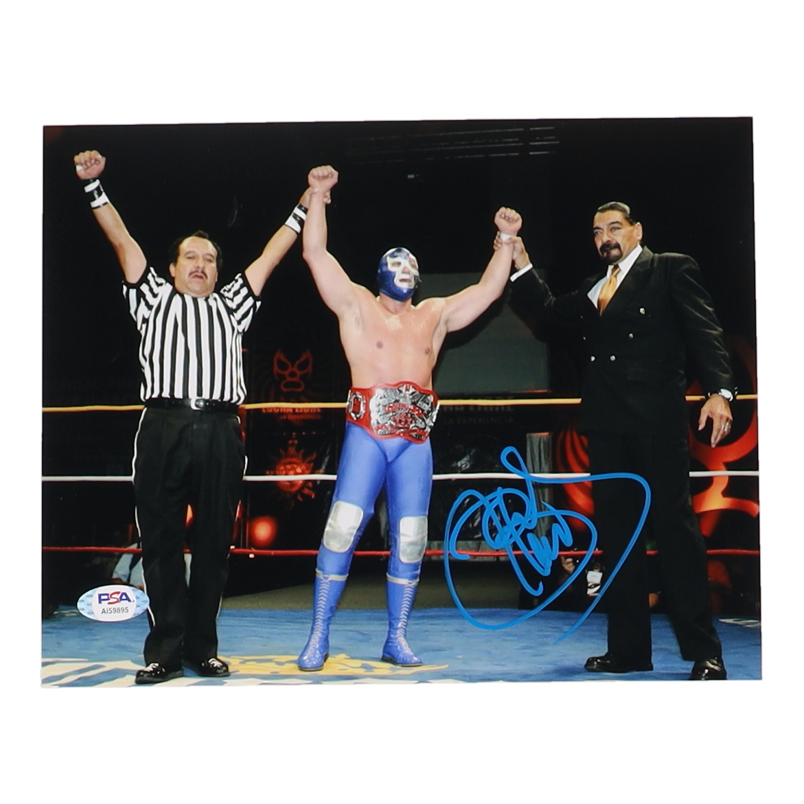 Photo measures 8" x 10" in size. Hand-signed by Blue Demon Jr.