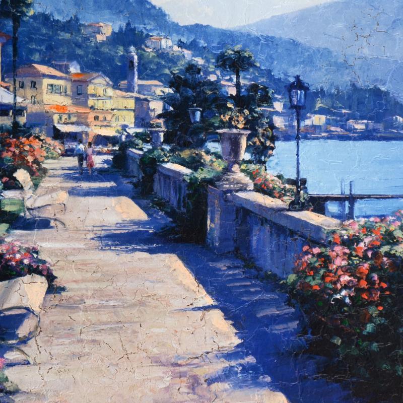 "Bellagio Promenade" is a limited edition hand embellished giclee on canvas with a crackled vecchia finish by Howard Behrens (1933-2014), numbered and hand signed by the artist. Measures approx. 17" x 27" (image).