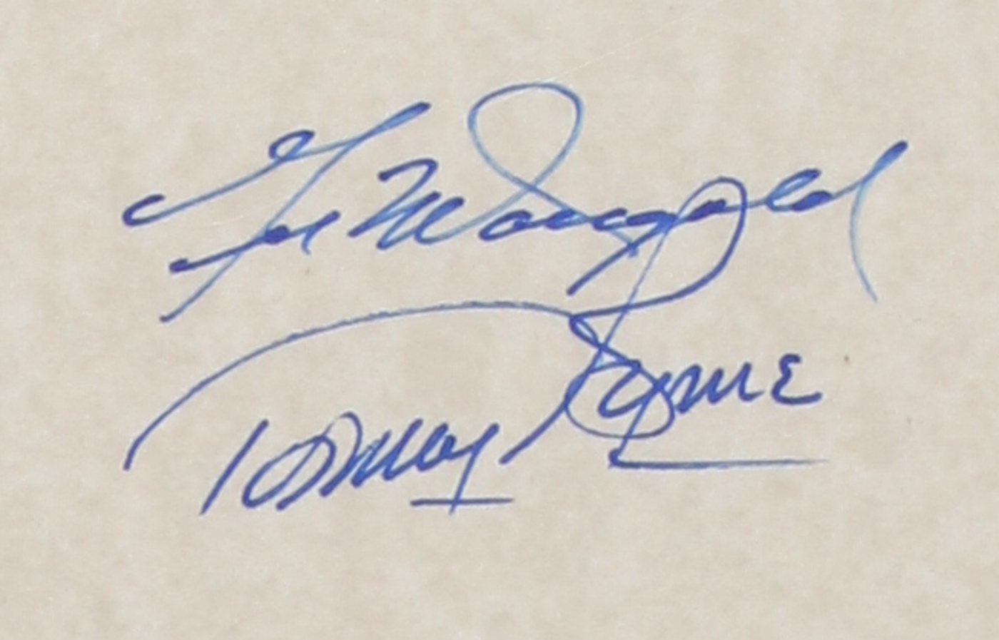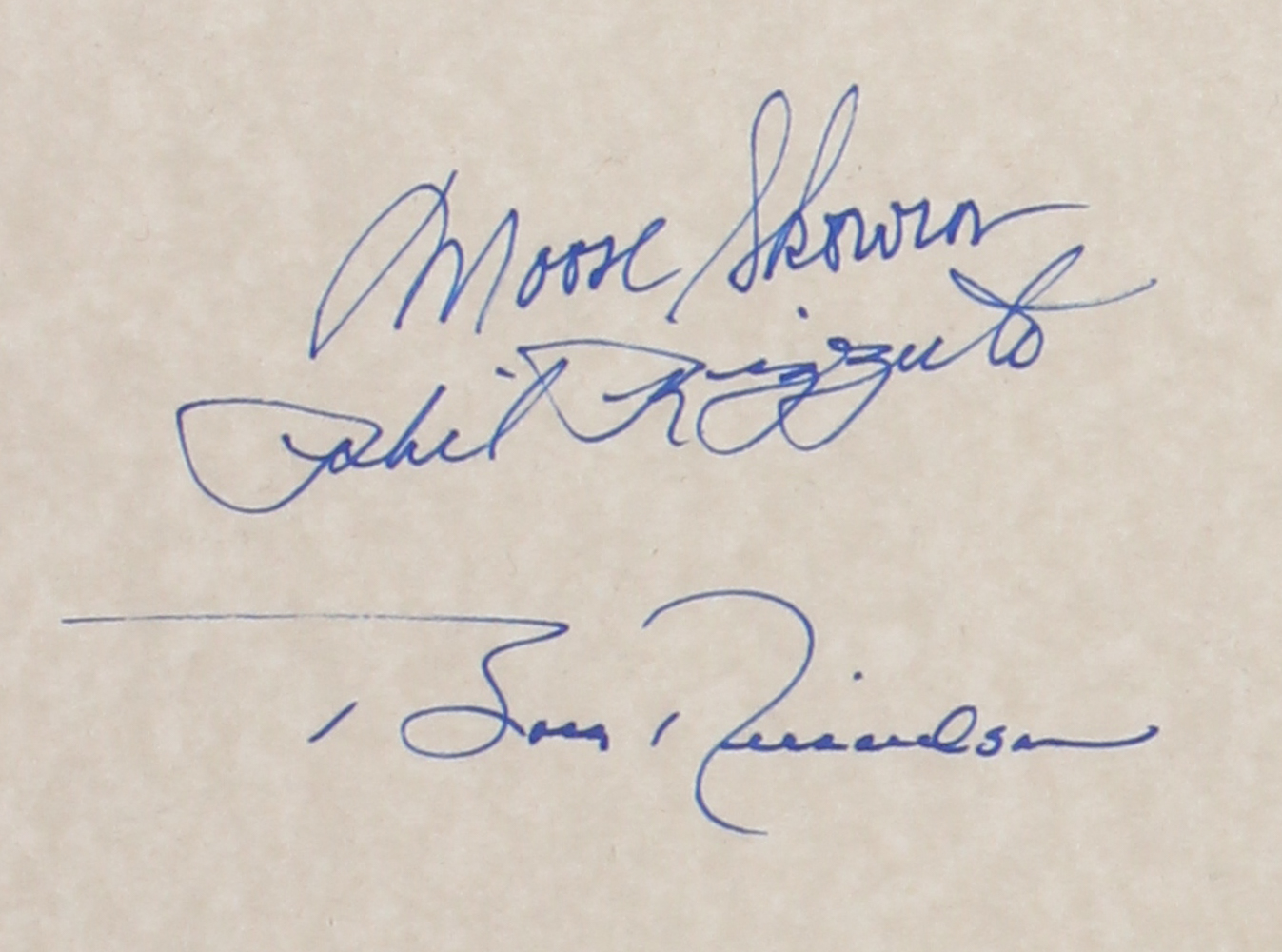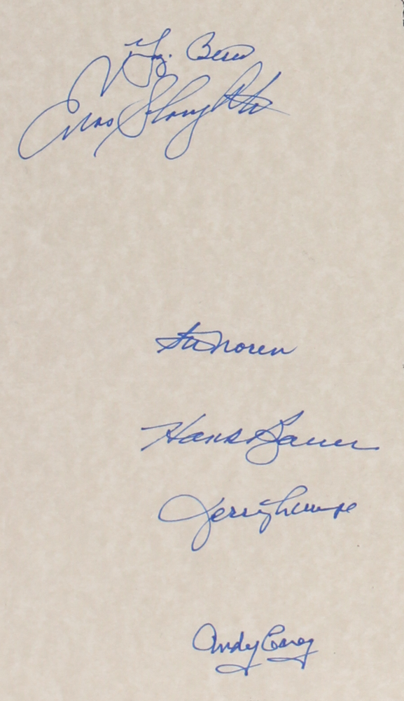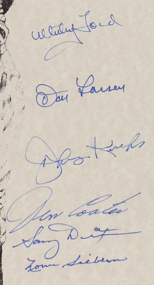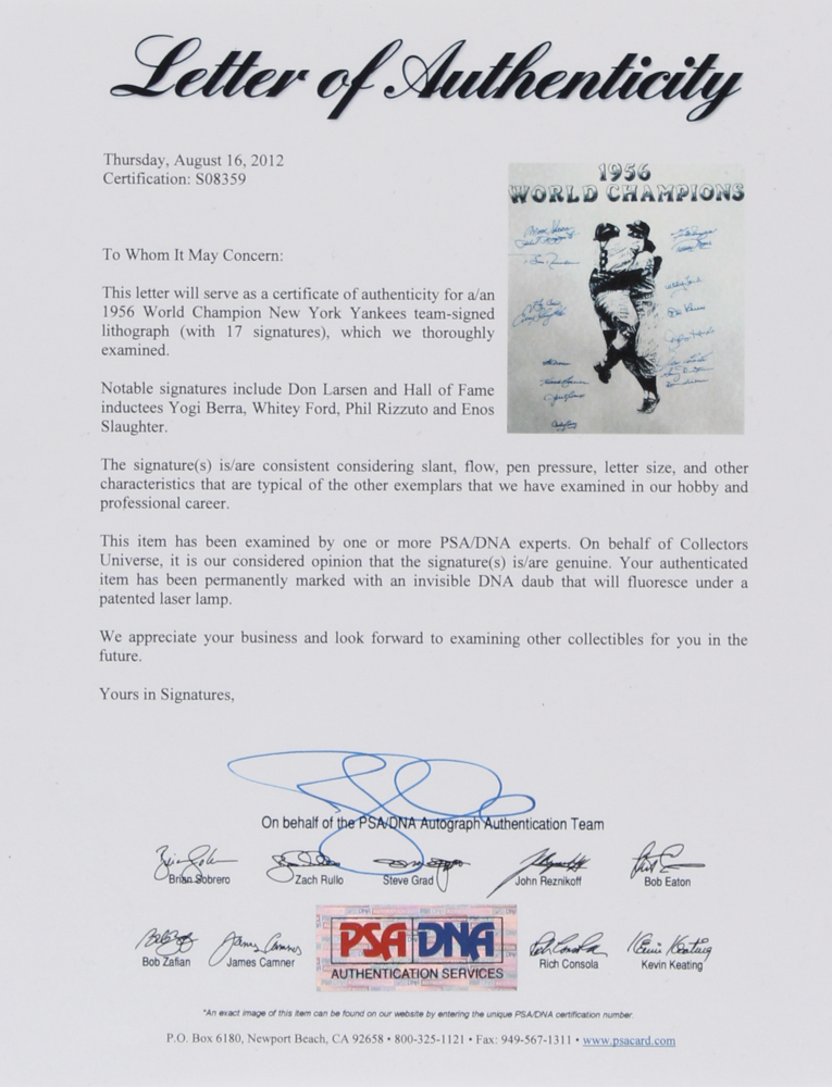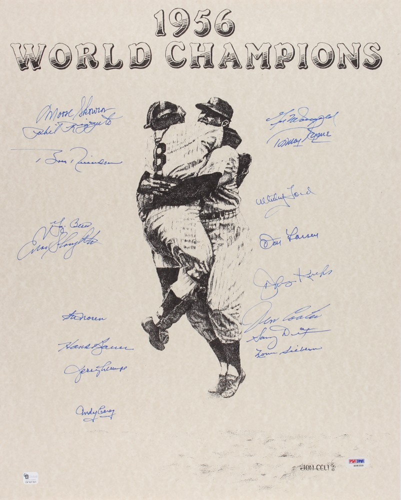 Lithograph measures 16" x 20" and has been hand signed in blue felt-tip pen by (17) members of the 1956 New York Yankees World Series Champions. Autographs include Yogi Berra, Enos Slaughter, Whitey Ford, Don Larsen, Phil Rizzuto, Hank Bauer, Bill "Moose" Skowron and others.