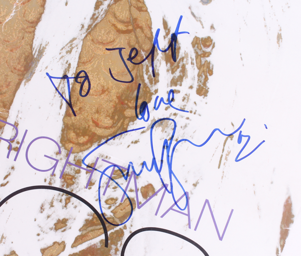 Poster measures 18" x 24" in size and has been hand-signed and inscribed in blue felt-tip pen by Sarah Brightman. Please note signature has been personalized to Jeff. Also note, poster has been bent and shows creases. Please see photos for more details.