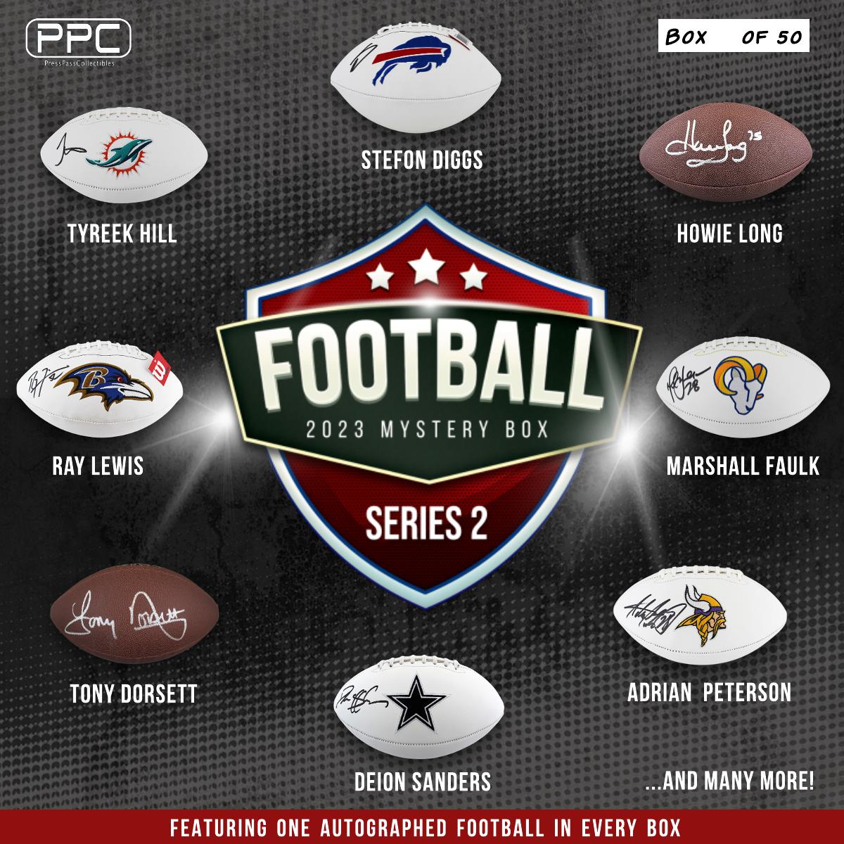 The Press Pass Collectibles 2023 football mystery box includes one (1) autographs in every box. Each box will include one (1) autographed football from your favorite NFL athletes past and present. Some boxes will feature items Stefon Diggs, Marshall Faulk, Adrian Peterson, Ray Lewis, and many more!