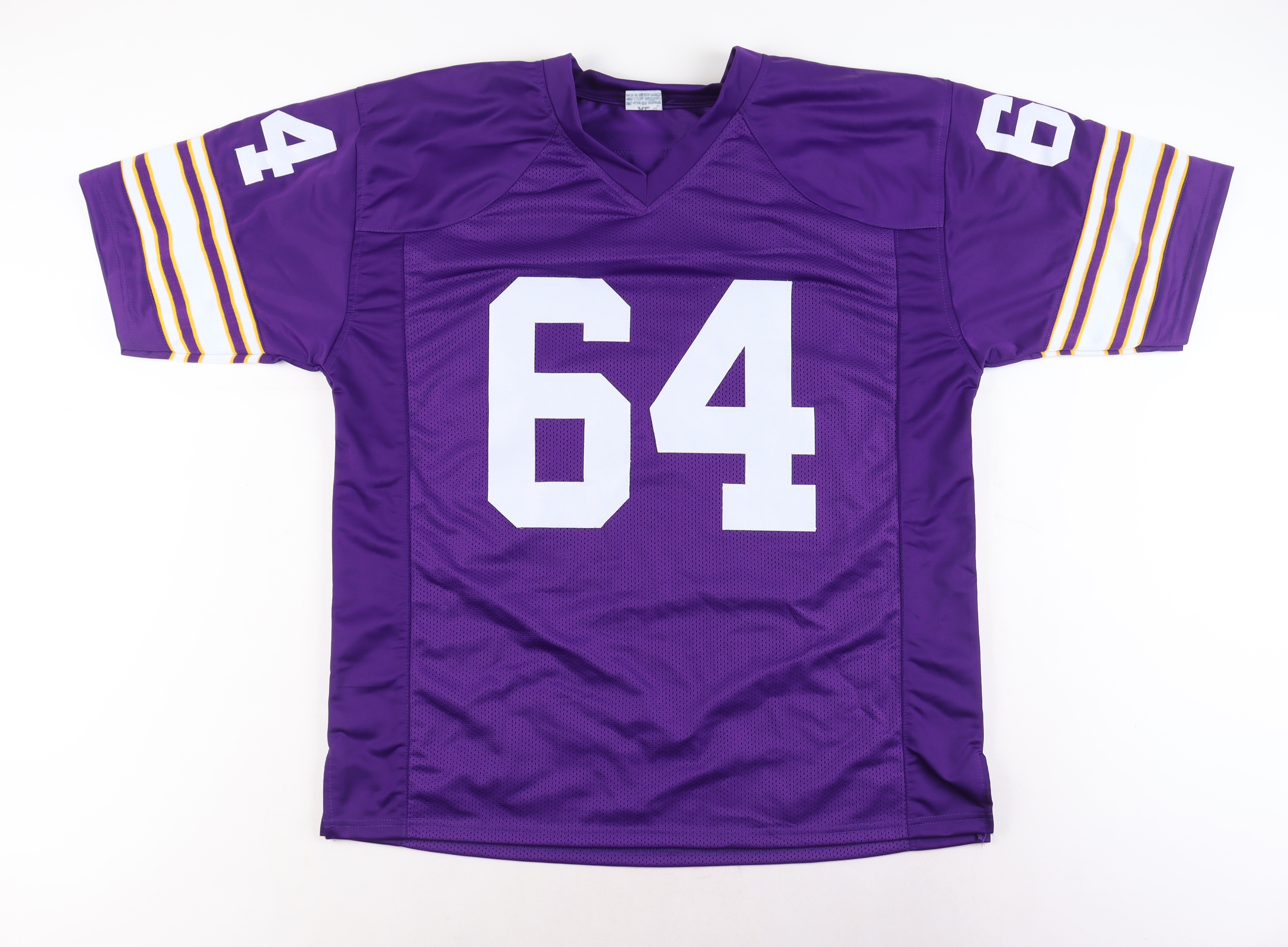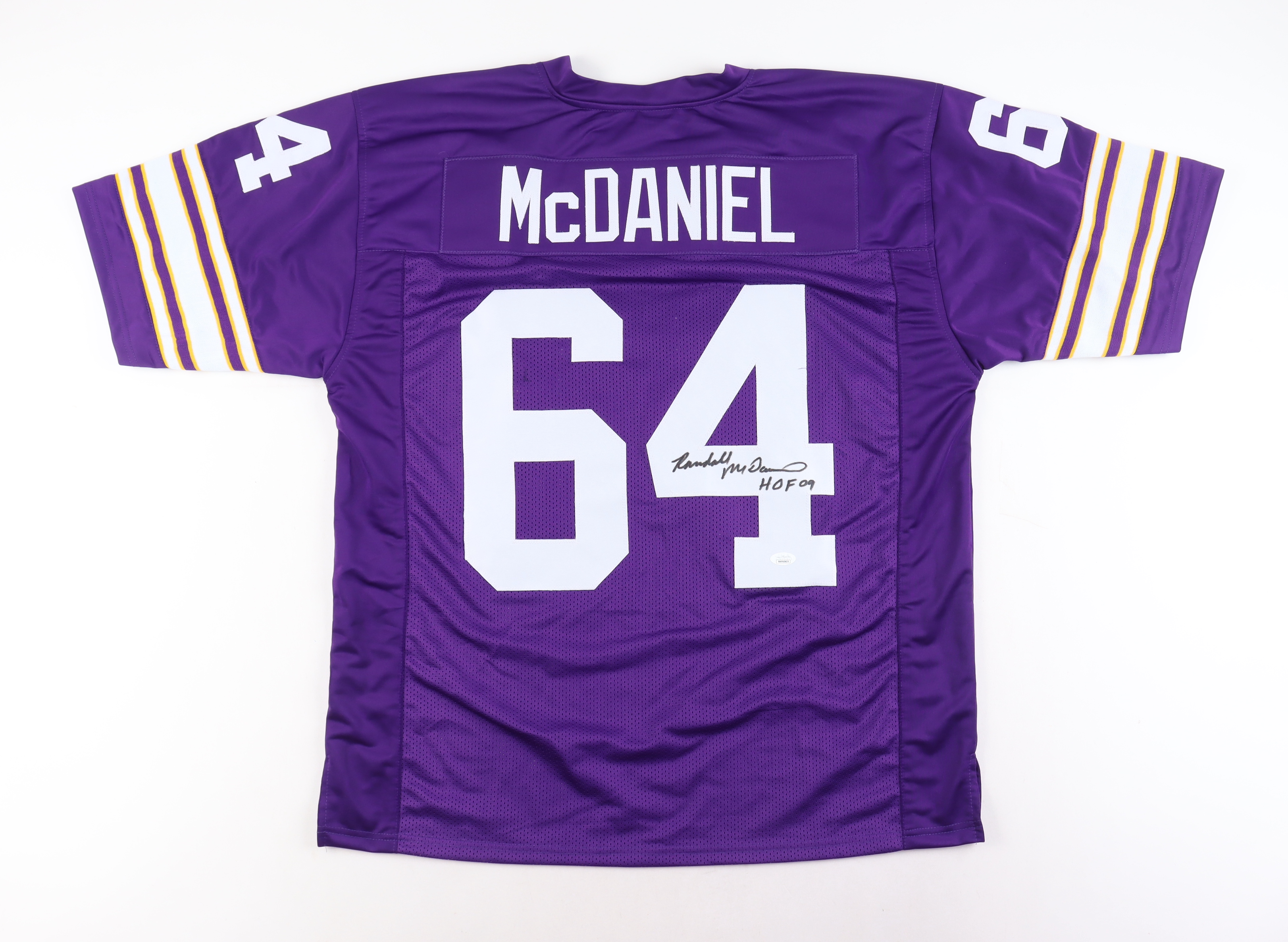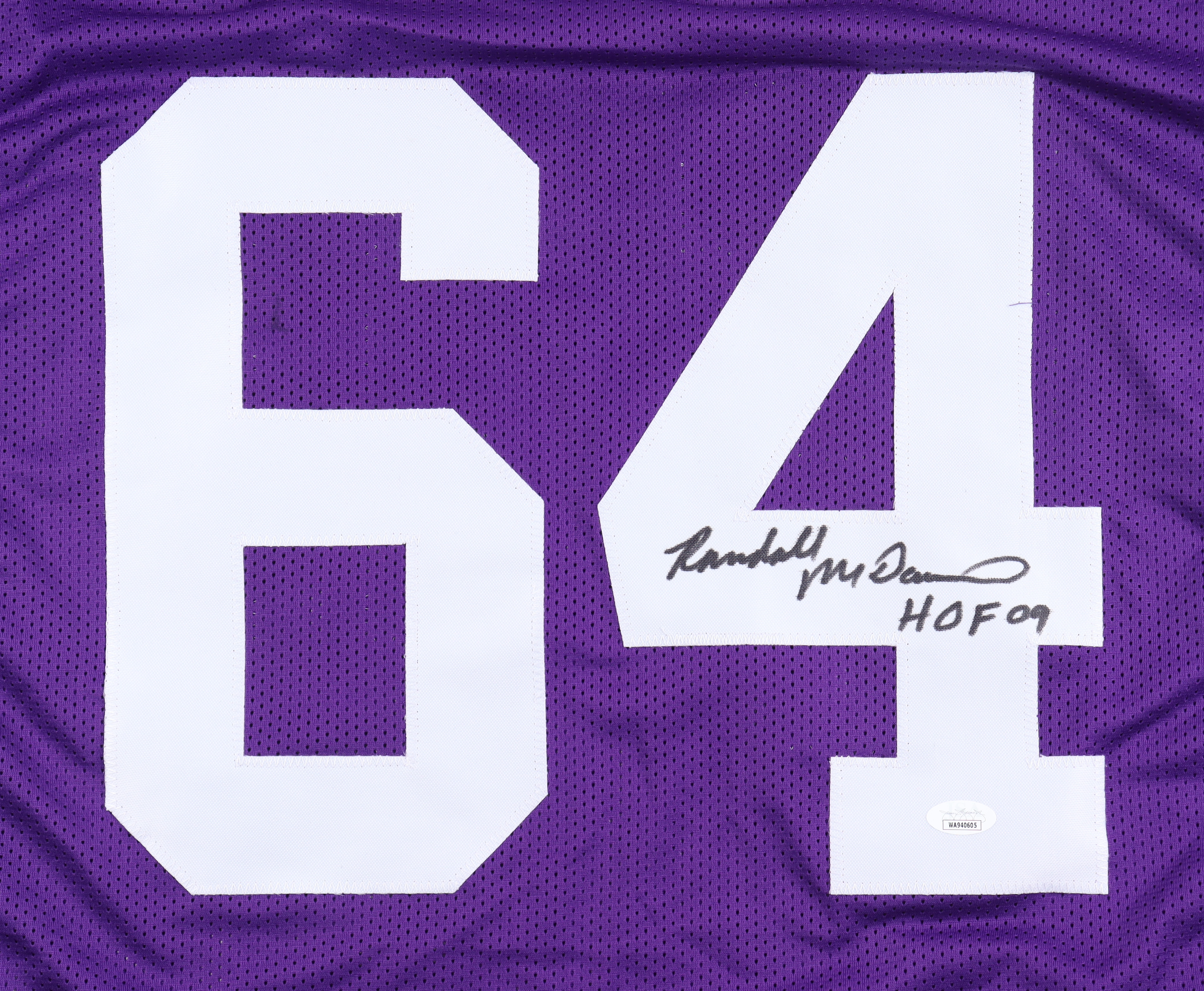 Custom jersey. Everything sewn on, size XL. Hand-signed and inscribed by Randall McDaniel (HOF).