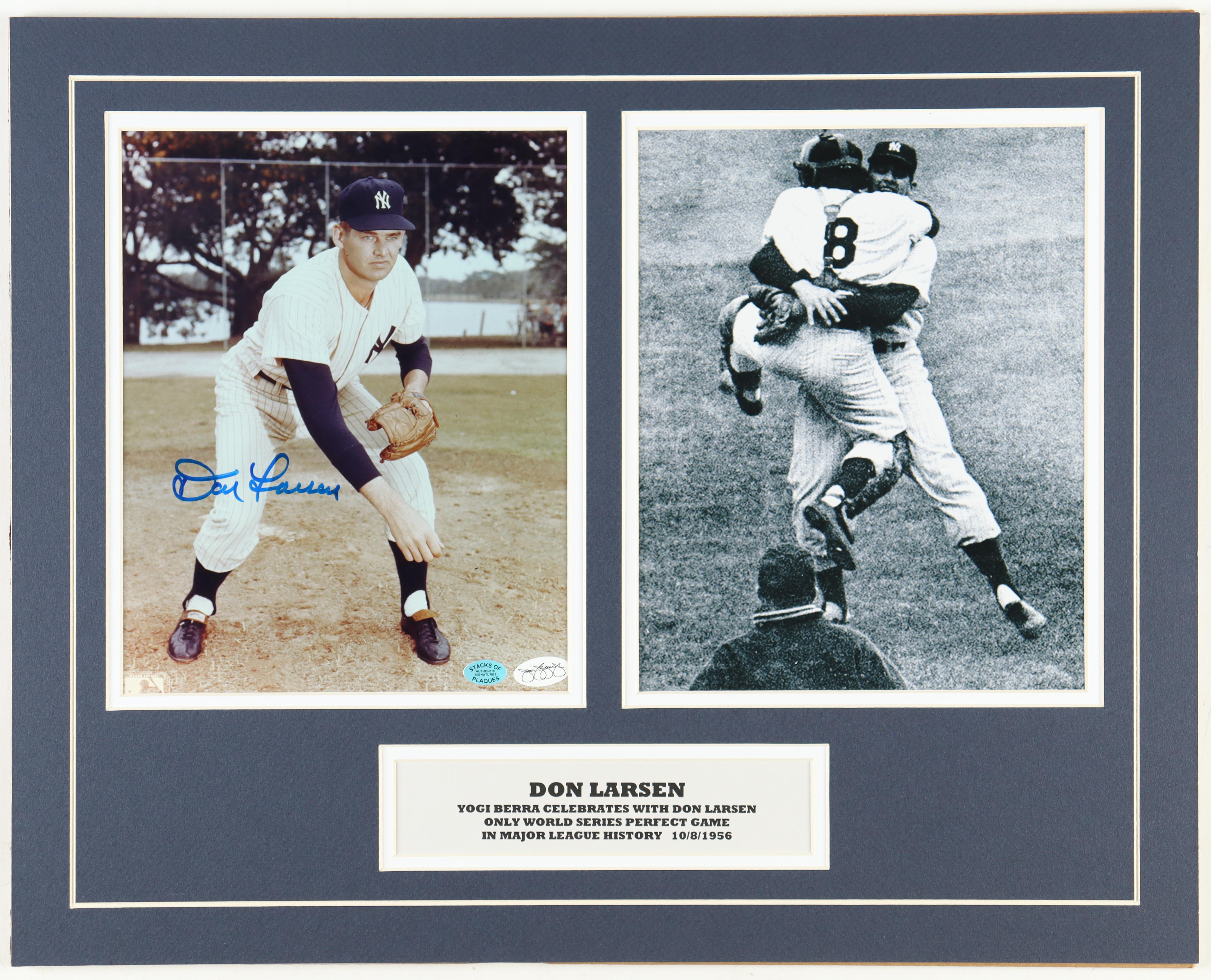 Custom matting measures approximately 16" x 20" in size. Features (2) 8" x 10" photos of Larsen. Left photo has been hand-signed by Don Larsen (D. 2020, New York Yankees). Please refer to photo for condition of the display.