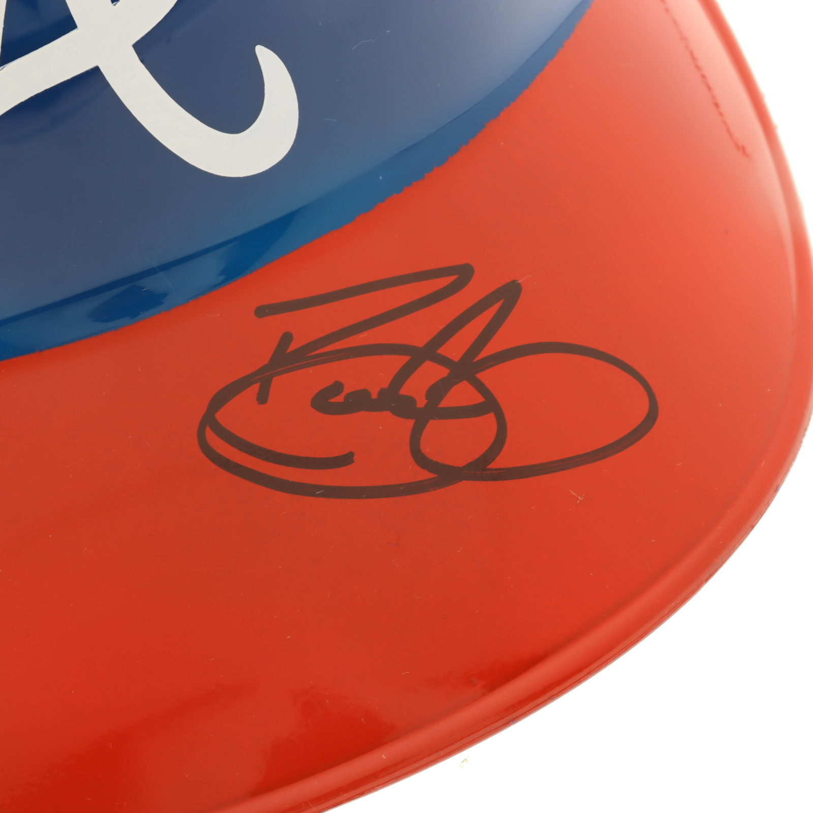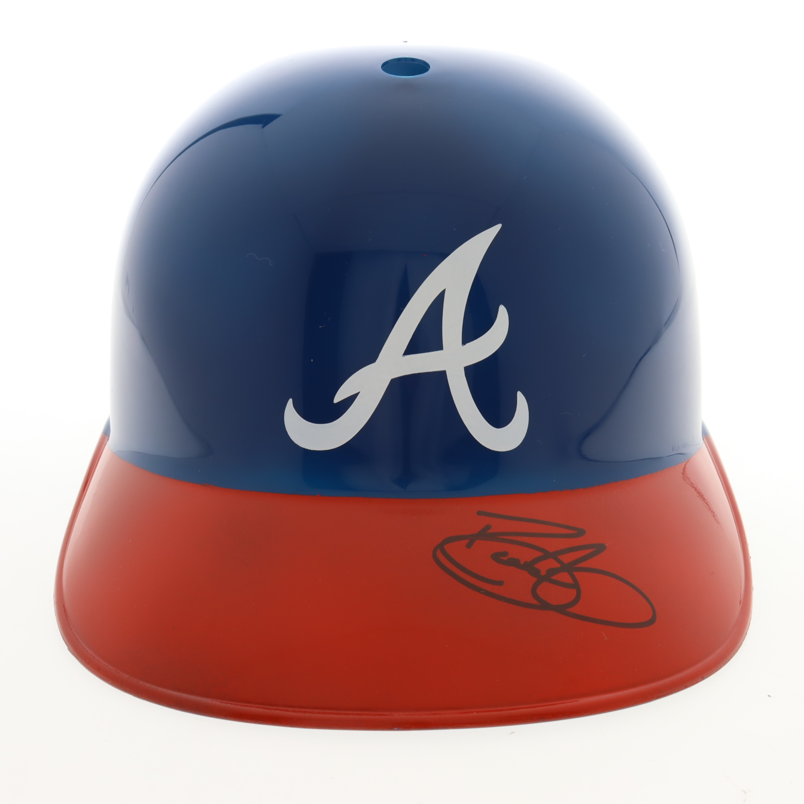 Atlanta Braves full-size plastic souvenir replica batting helmet. Hand-signed by David Justice.