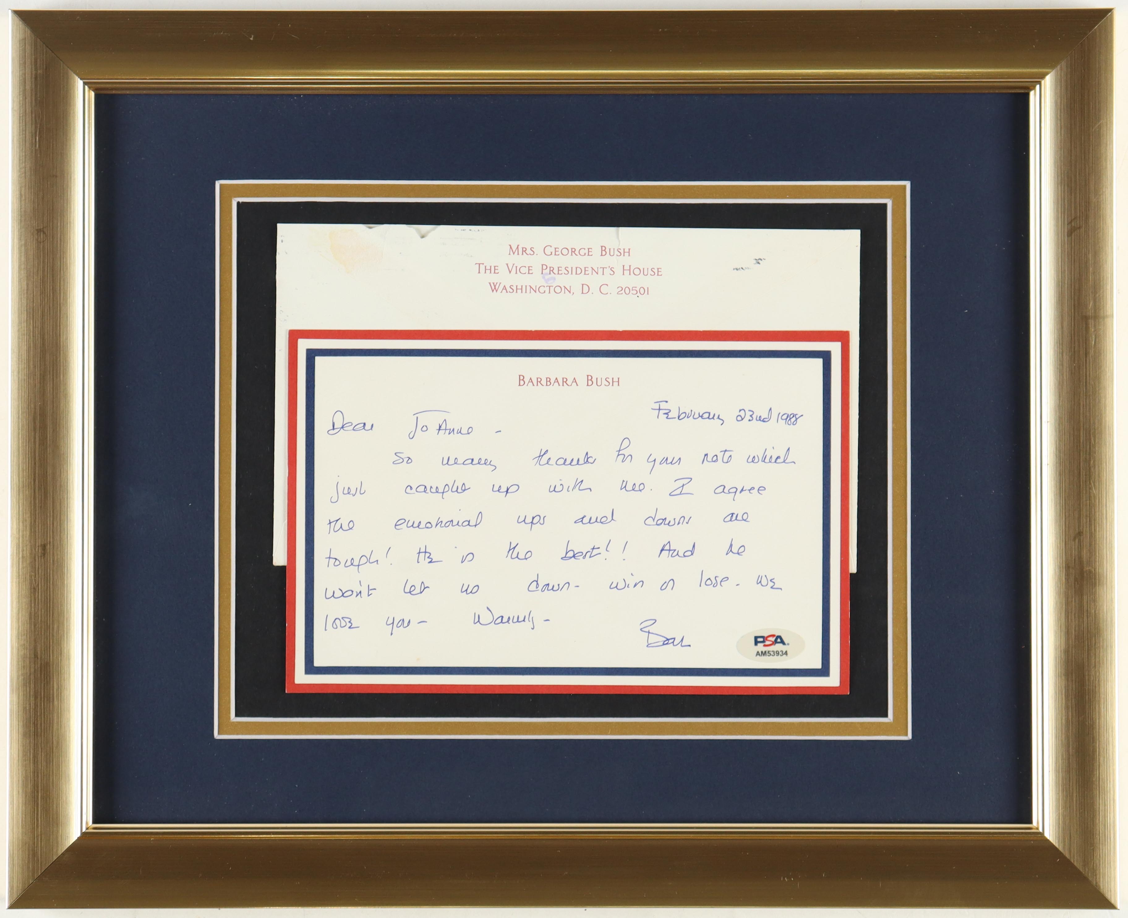 1988 Barbara Bush Signed 13x16 Custom Framed Hand Written Letter On Vice Presidential Letterhead And Envelope (PSA)