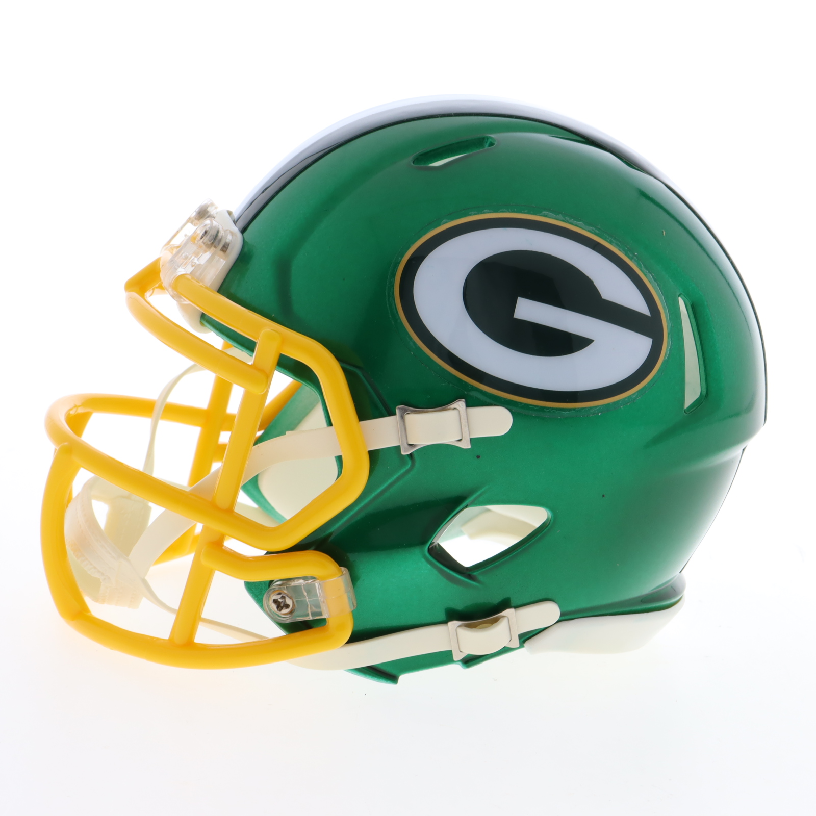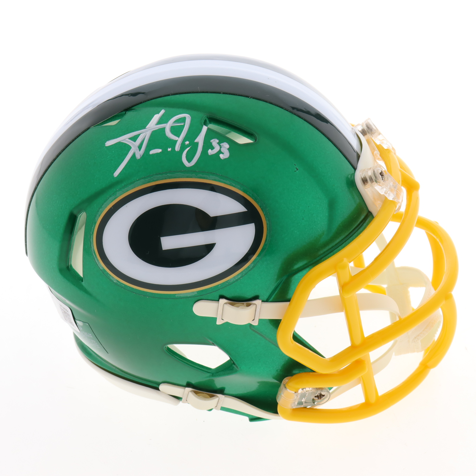 Riddell Green Bay Packers Flash Alternate Speed mini helmet. Hand-signed by Aaron Jones.