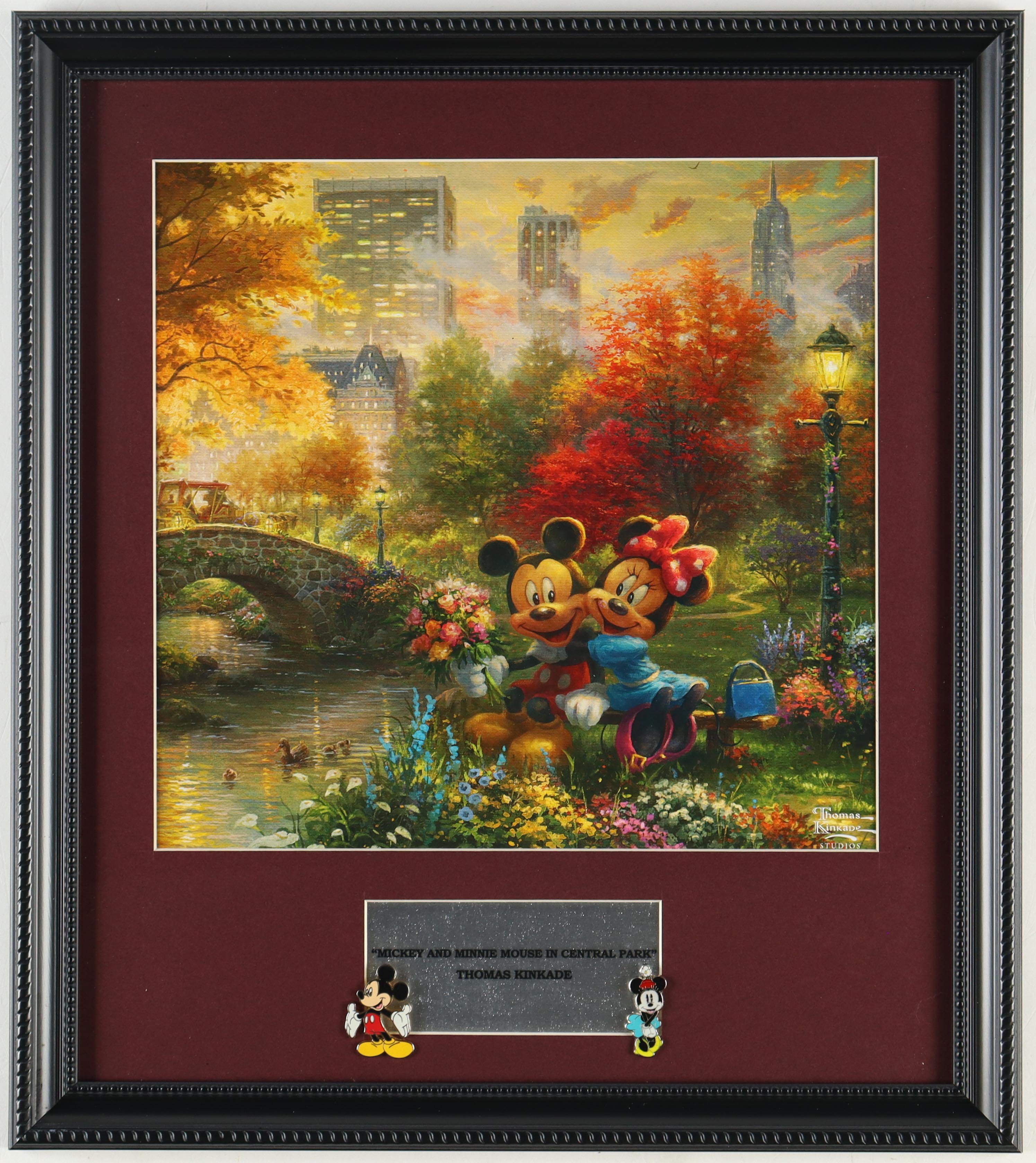 Thomas Kinkade Walt Disney's "Mickey & Minnie Mouse In Central Park" Custom Framed Print Display with Mickey & Minnie Mouse Pins