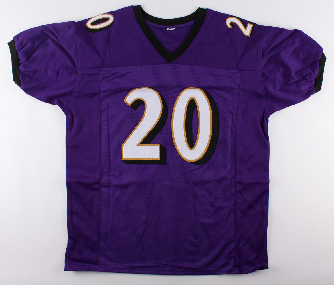 Custom on-field style jersey. Everything sewn on, size XL . Hand-signed in black felt tip pen by Ed Reed (Ravens).