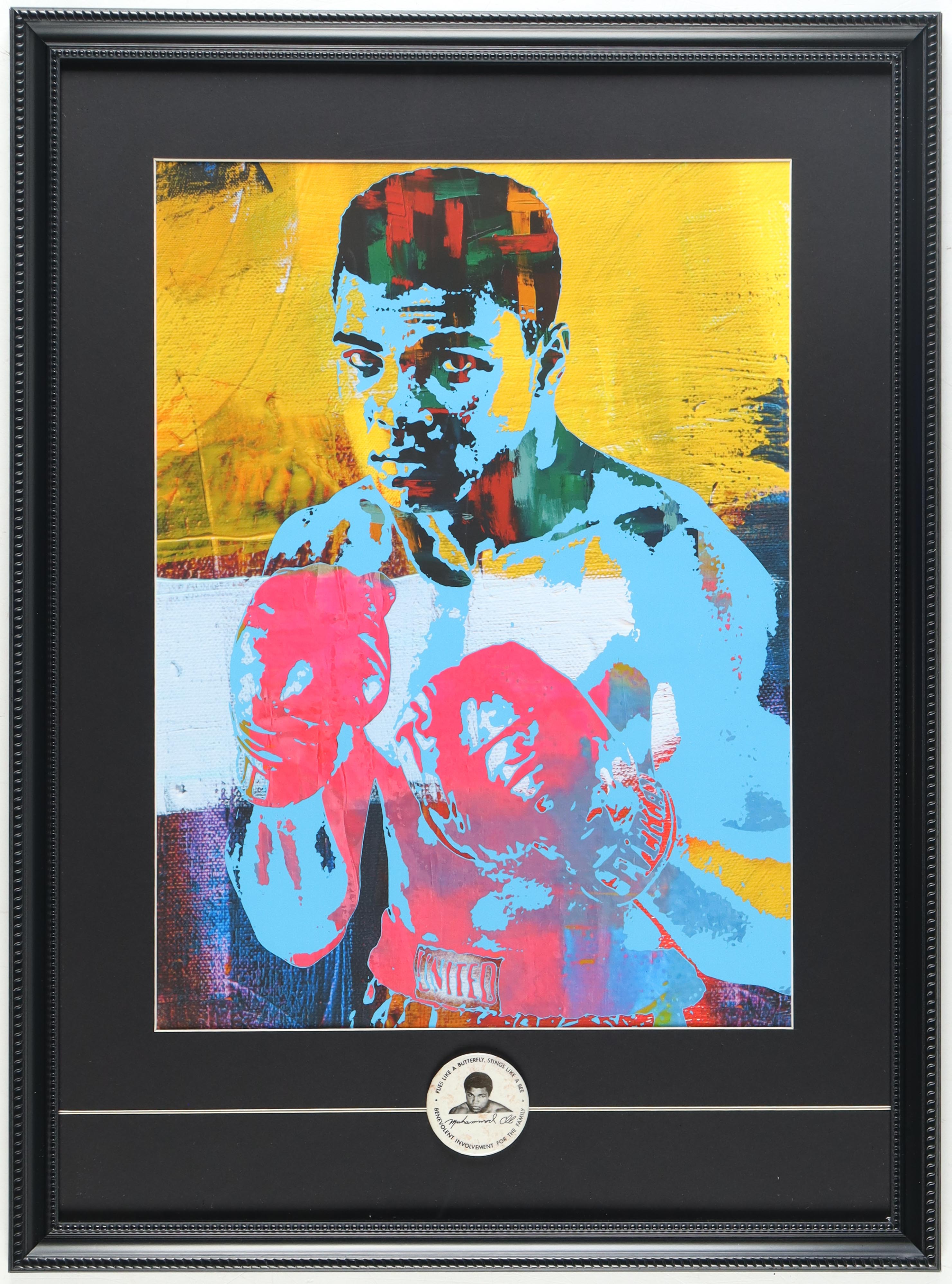 Muhammad Ali Custom Framed Modern Art Print Display with Original Muhammad Ali "Flies Like A Butterfly Stings Like A Bee" Vintage Pin