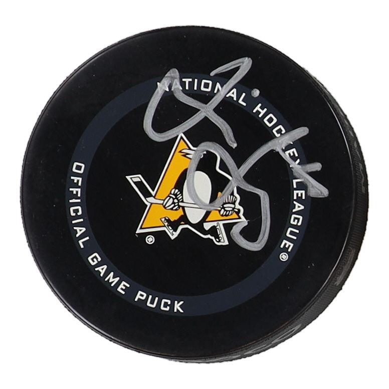 Pittsburgh Penguins logo hockey puck has been hand-signed by Jaromir Jagr.