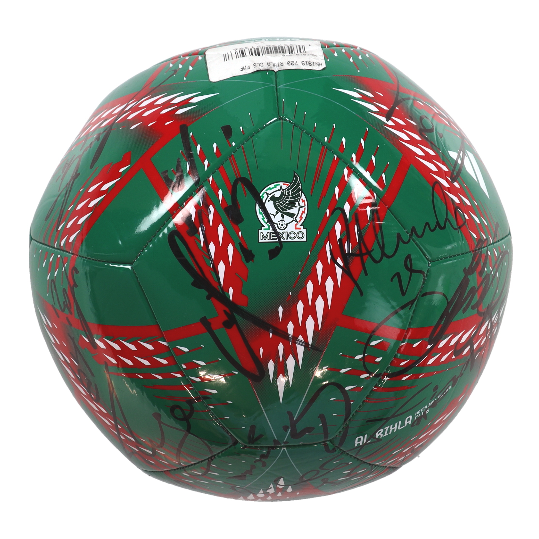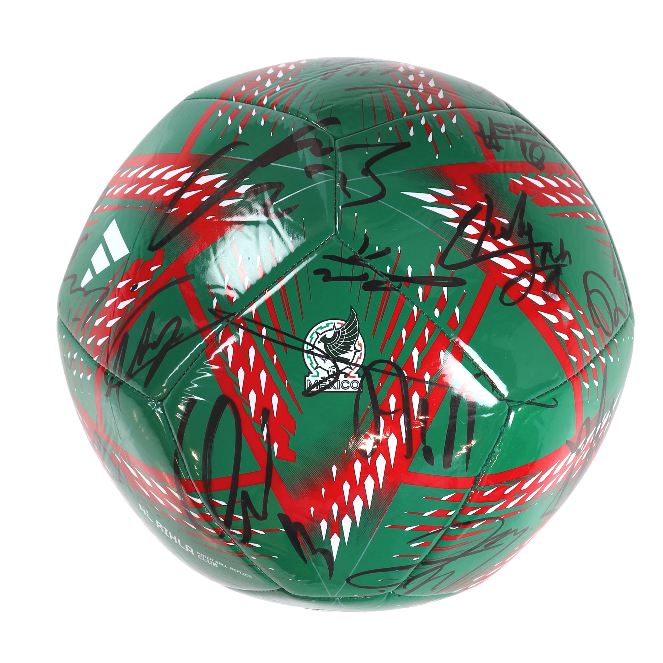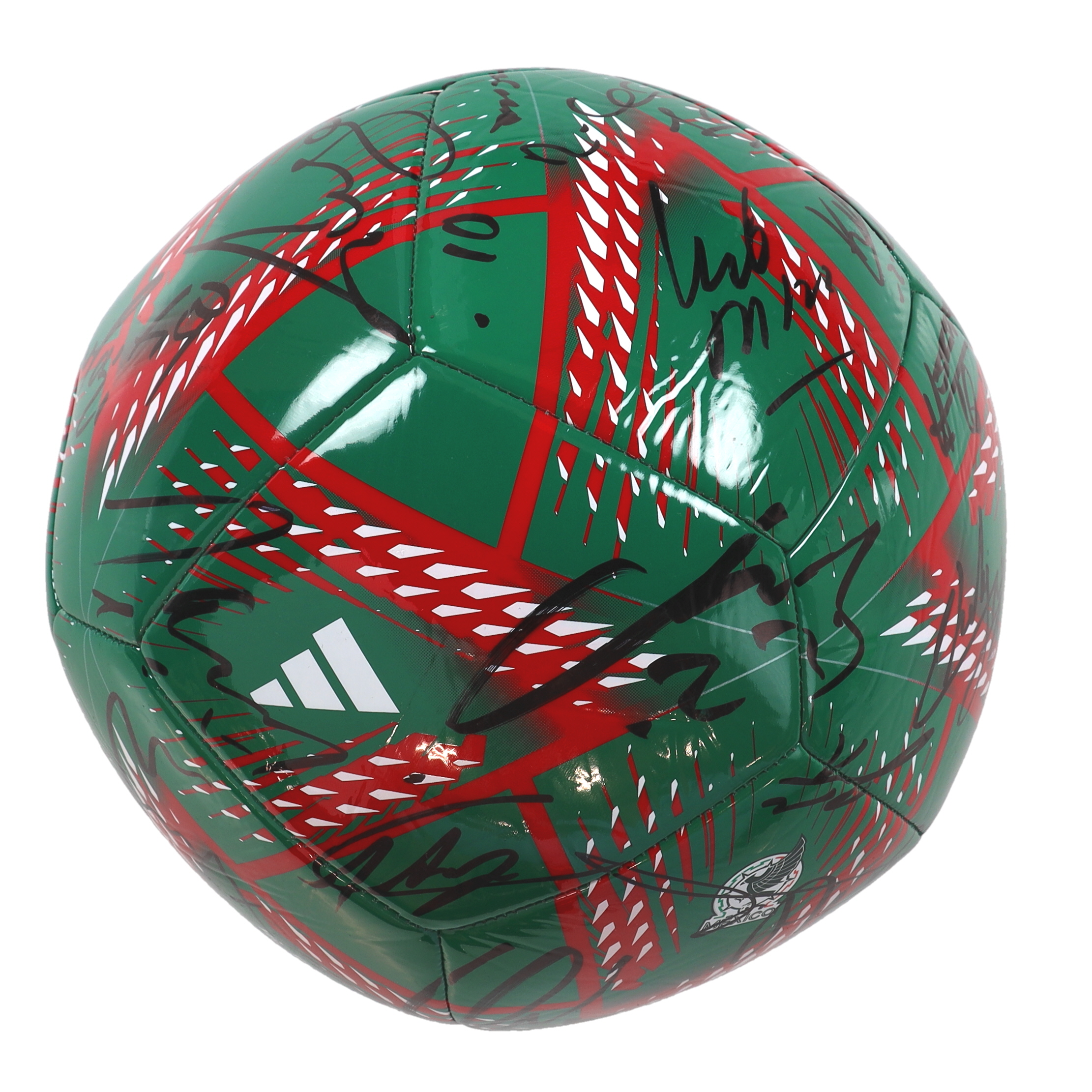 Mexico National Football Team Logo soccer ball. Hand-signed by (26) with Roberto Alvarado, Edson Álvarez, Kevin Álvarez, Néstor Araujo, Gerardo Arteaga, Fernando Beltrán, Luis Chávez, Rodolfo Cota, Rogelio Funes Mori, Santiago Giménez, Andrés Guardado, Erick Gutiérrez, Héctor Herrera, Raúl Jiménez, Diego Lainez, Hirving Lozano, Henry Martín, Gerardo Martino, César Montes, Héctor Moreno, Guillermo Ochoa, Orbelín Pineda, Carlos Rodríguez, Jorge Sánchez, Alfredo Talavera and Alexis Vega.