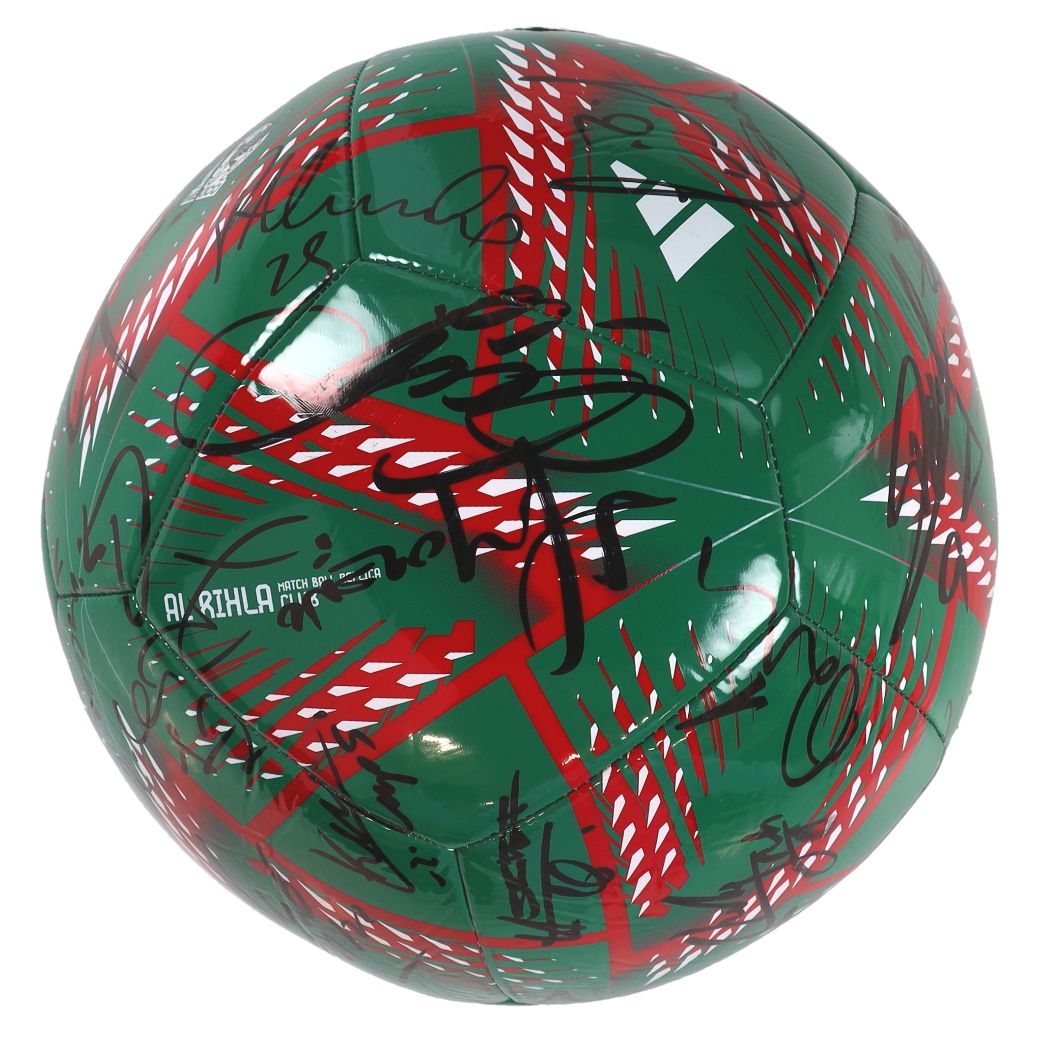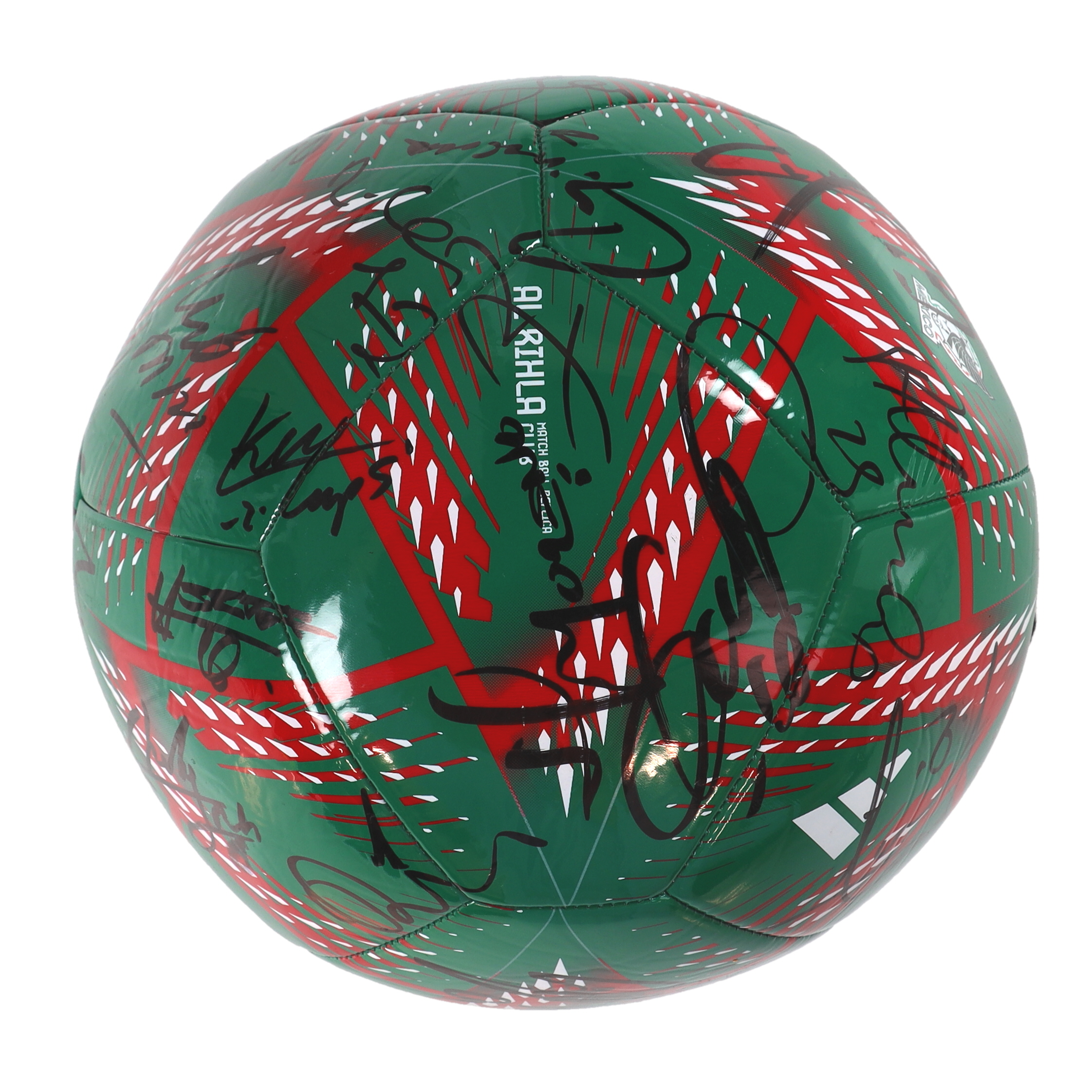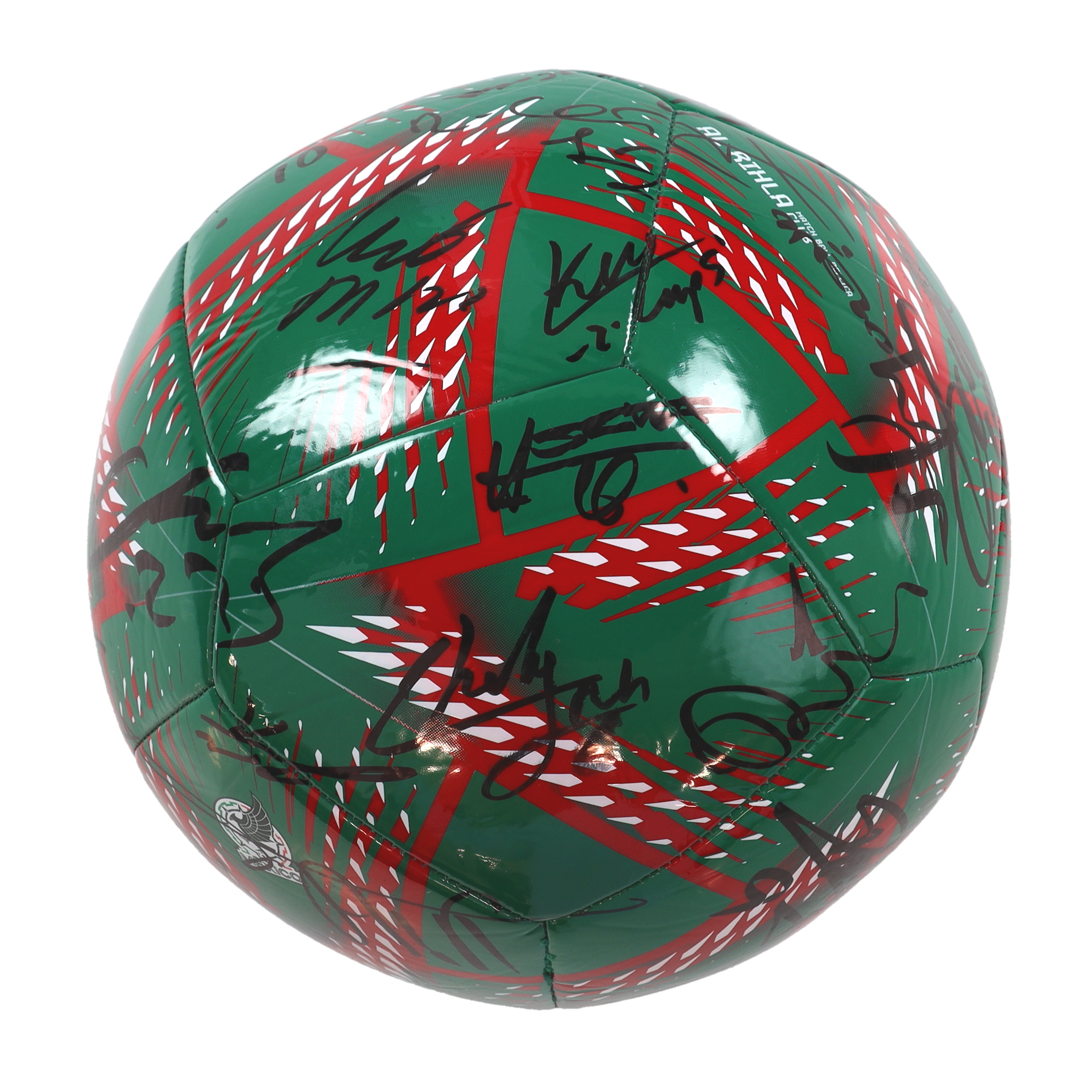 Mexico National Football Team Logo soccer ball. Hand-signed by (26) with Roberto Alvarado, Edson Álvarez, Kevin Álvarez, Néstor Araujo, Gerardo Arteaga, Fernando Beltrán, Luis Chávez, Rodolfo Cota, Rogelio Funes Mori, Santiago Giménez, Andrés Guardado, Erick Gutiérrez, Héctor Herrera, Raúl Jiménez, Diego Lainez, Hirving Lozano, Henry Martín, Gerardo Martino, César Montes, Héctor Moreno, Guillermo Ochoa, Orbelín Pineda, Carlos Rodríguez, Jorge Sánchez, Alfredo Talavera and Alexis Vega.