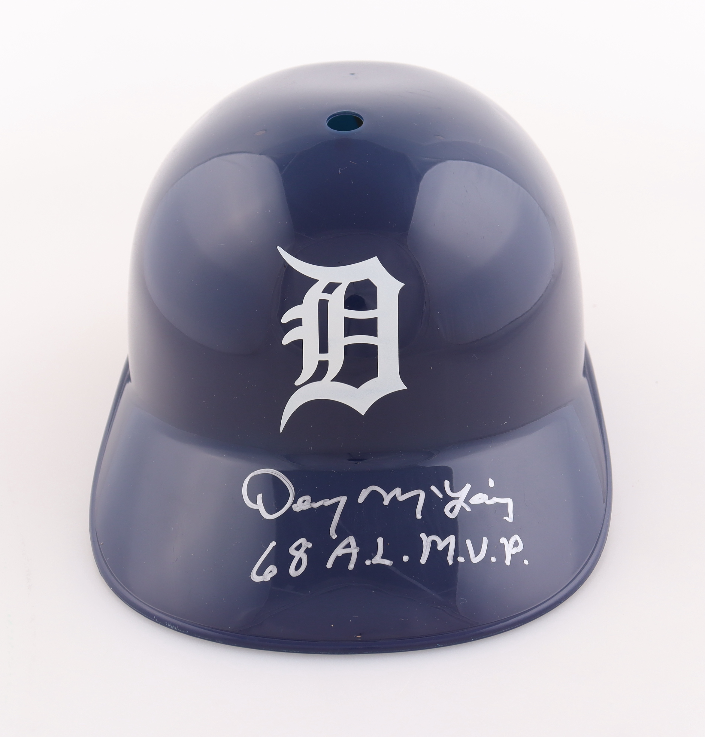 Detroit Tigers full-size plastic souvenir replica batting helmet. Hand-signed and inscribed by Denny McLain.
