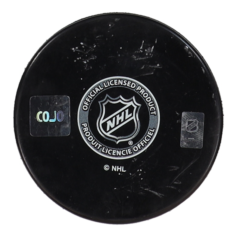 Boston Bruins logo hockey puck. Hand-signed and inscribed by Ray Bourque (HOF).