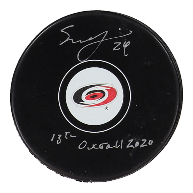 Seth Jarvis Signed Hurricanes Logo Hockey Puck Inscribed "13th Overall 2020" (COJO)