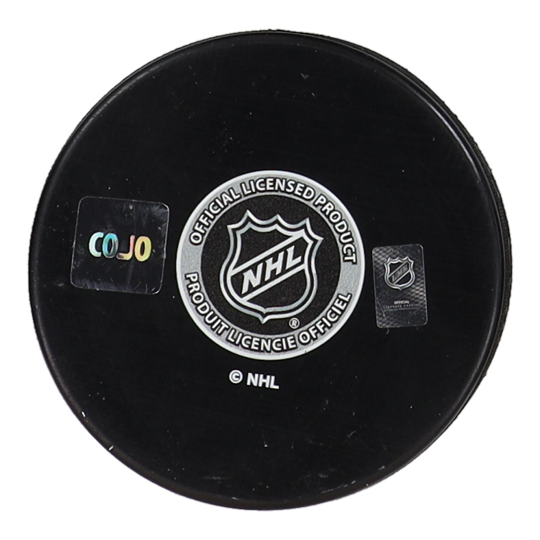 Carolina Hurricanes logo hockey puck. Hand-signed and inscribed by Seth Jarvis.