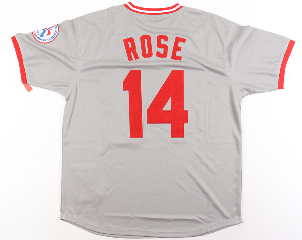Custom jersey with everything is sewn on, size 44. Hand-signed by Pete Rose.
