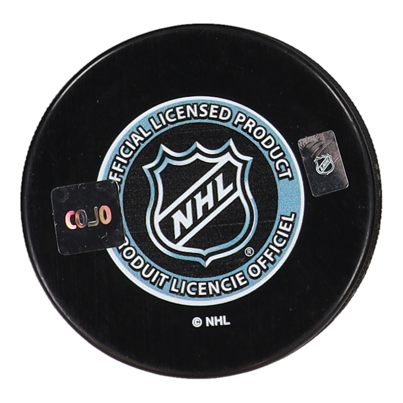 Montreal Canadiens logo hockey puck. Hand-signed and inscribed by Yvan Cournoyer (HOF).