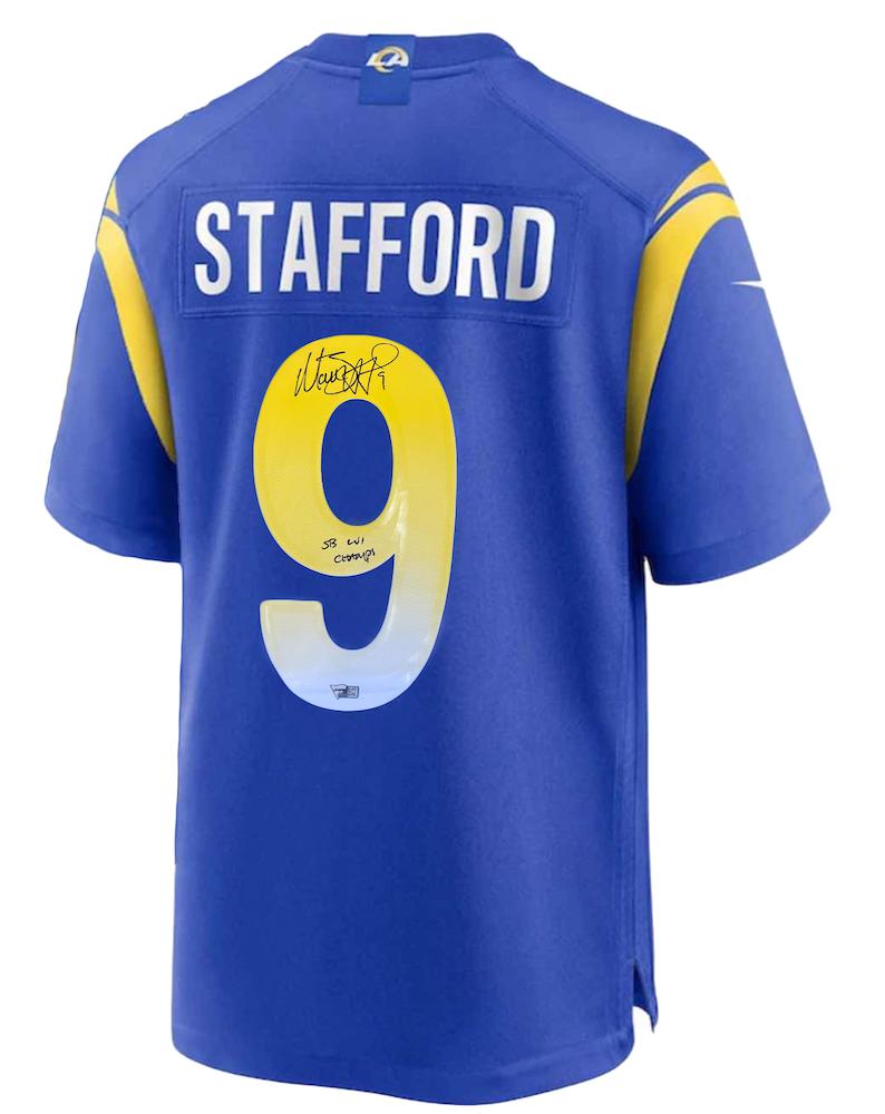 Nike jersey. Everything printed on, size XL. Hand-signed and inscribed by Matthew Stafford (Los Angeles Rams).
