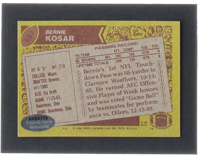 Bernie Kosar Signed 1986 Topps #187 RC (Schwartz)
