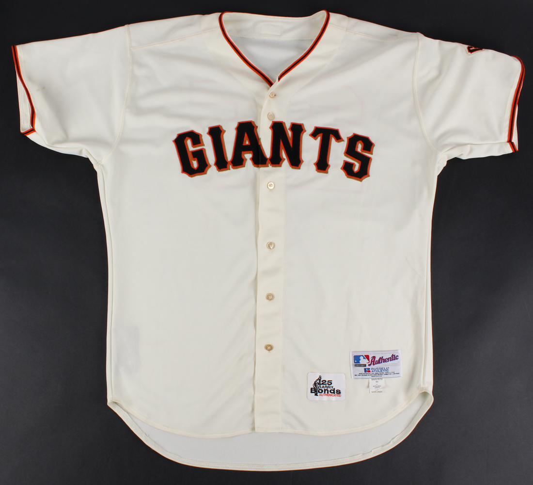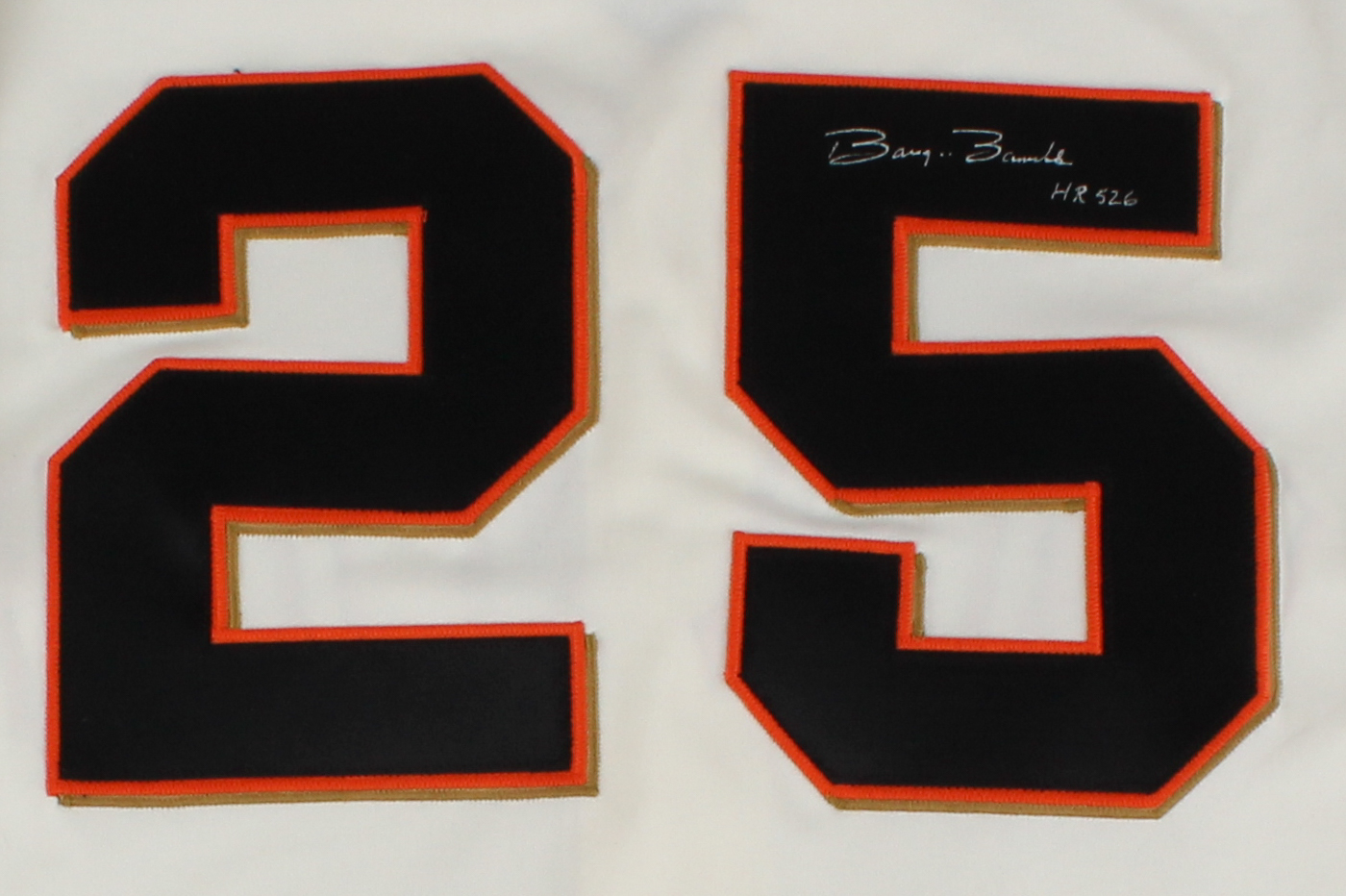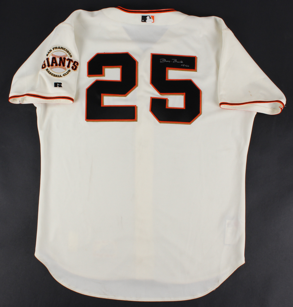 Russell Athletics game jersey, size 50 (length +2). The jersey was worn by Barry Bonds during the game in which he hit his 526th career home run in 2001. Hand-signed and inscribed in silver paint pen by Barry Bonds. Please note: The jersey does contain some staining and marking from use in game.