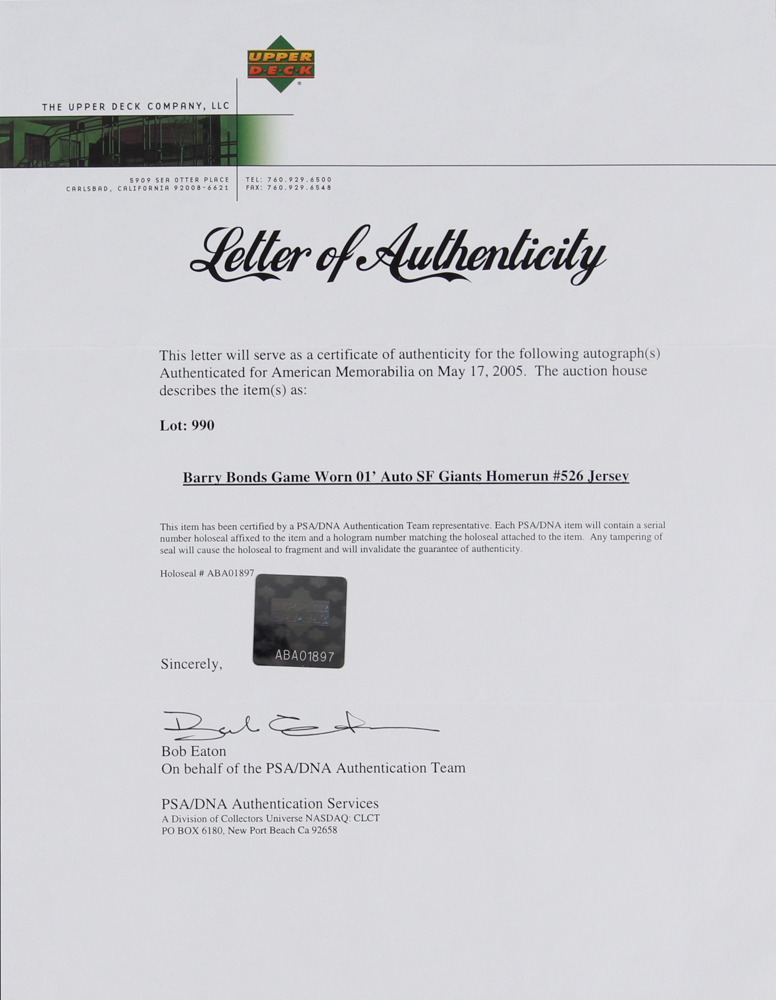 Barry Bonds Signed Giants Game-Used 2001 Jersey Inscribed "HR 526" (UDA LOA)