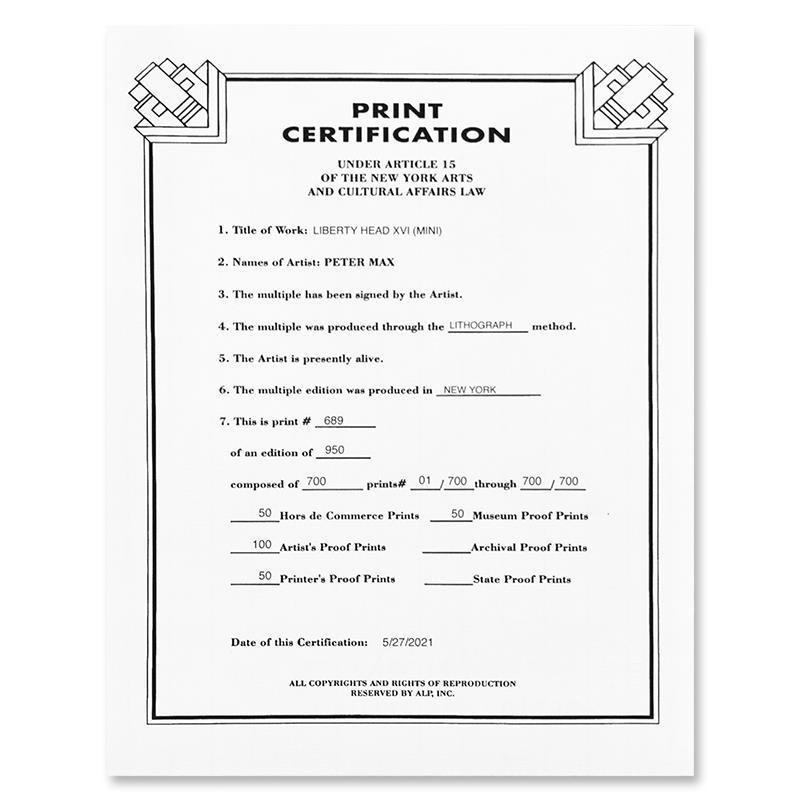 "Liberty Head XVI" is a limited edition lithograph on paper by Peter Max, numbered 689/700 and hand signed by the artist. This piece comes framed. Includes Certificate of Authenticity from Peter Max Studios. Measures approximately 21.5" x 21.5" (frame), 7" x 7" (image).