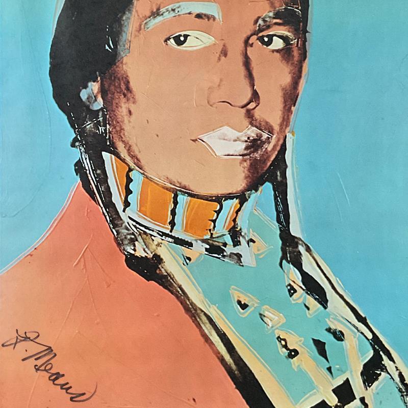 "The American Indian Series" is a vintage poster (1977) by Andy Warhol (1928-1987) from the Ace Gallery, Los Angeles, CA, hand signed by the artist and Russell Means (1939-2012). This piece comes custom framed. Includes Letter of Authenticity. Measures approx. 51" x 33" (frame), 47.5" x 29.5" (image). Due to the age of the piece there may be some waviness and/or minor wrinkles on the paper.