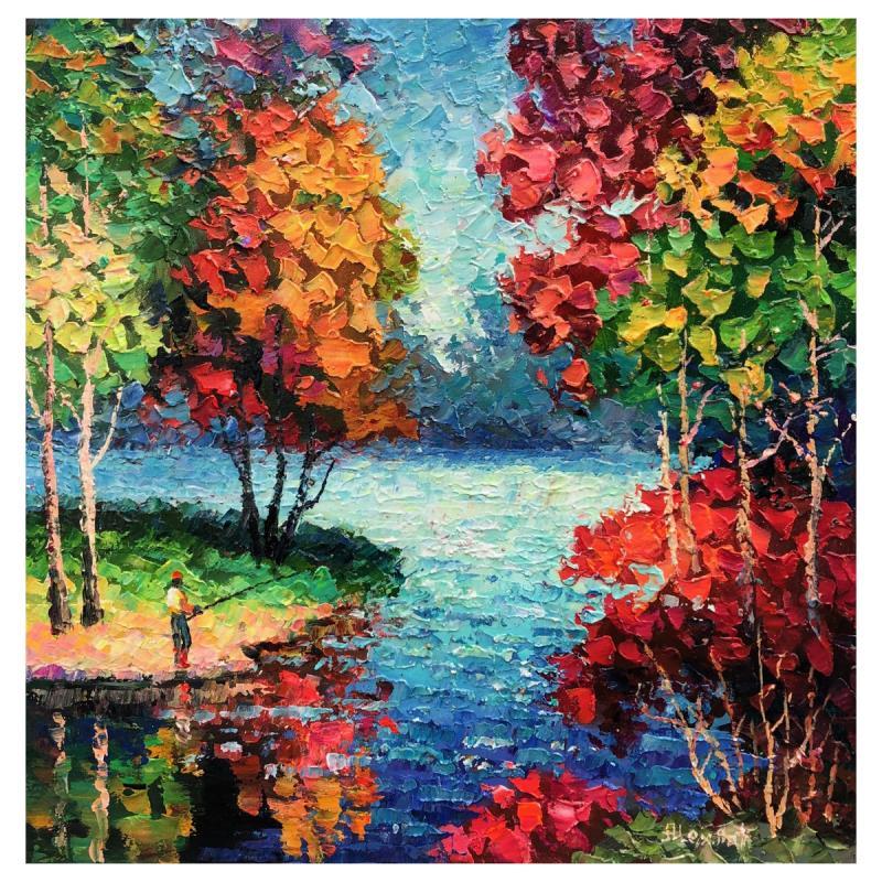 "Autumn Catch" is an original oil painting on stretched canvas by Alexander Antanenka. Hand signed by the artist, the piece comes with a letter of authenticity. Measures approximately 20" x 20" (image). There may be scuffs on the edges and corners which would be concealed when framed.