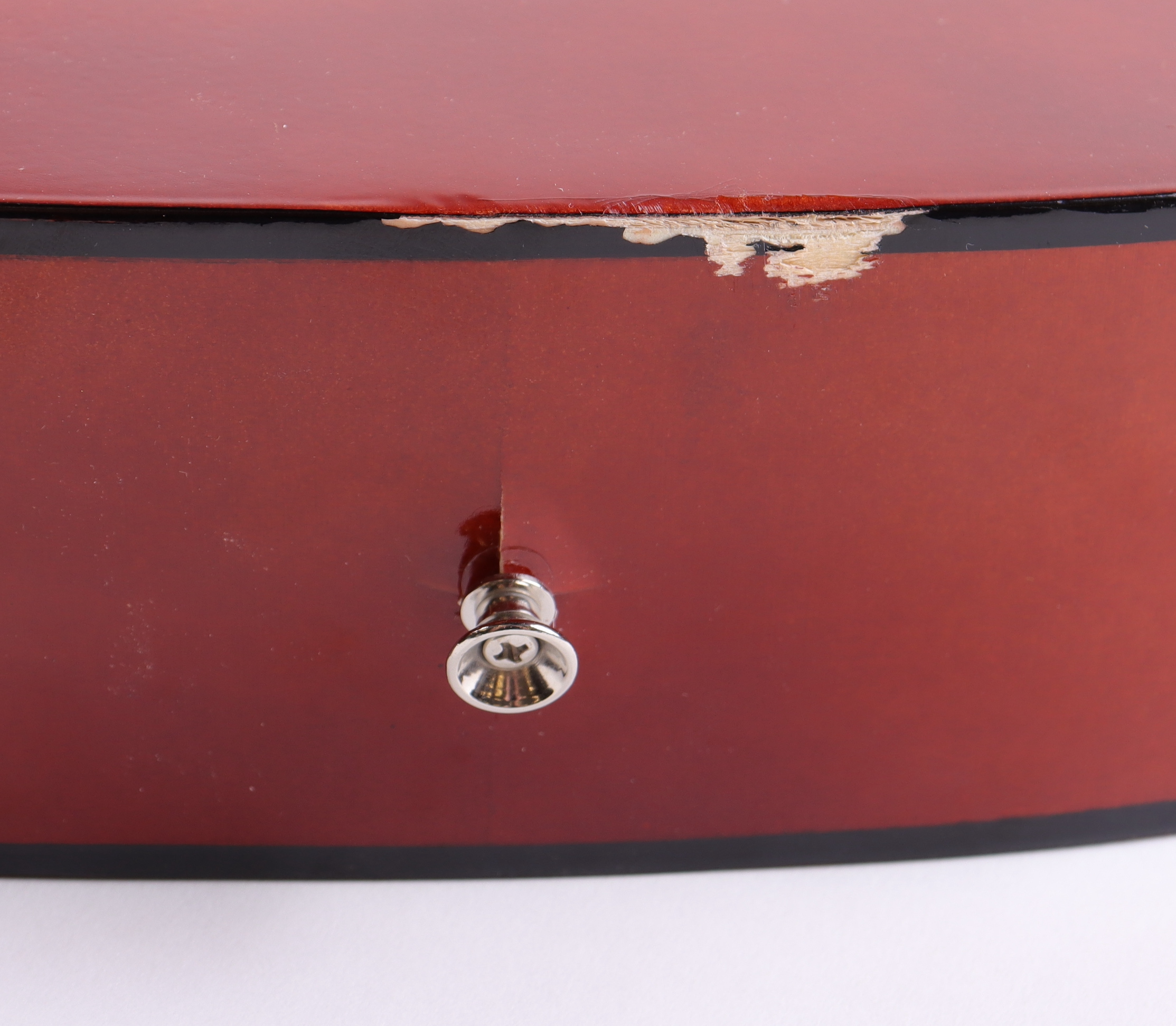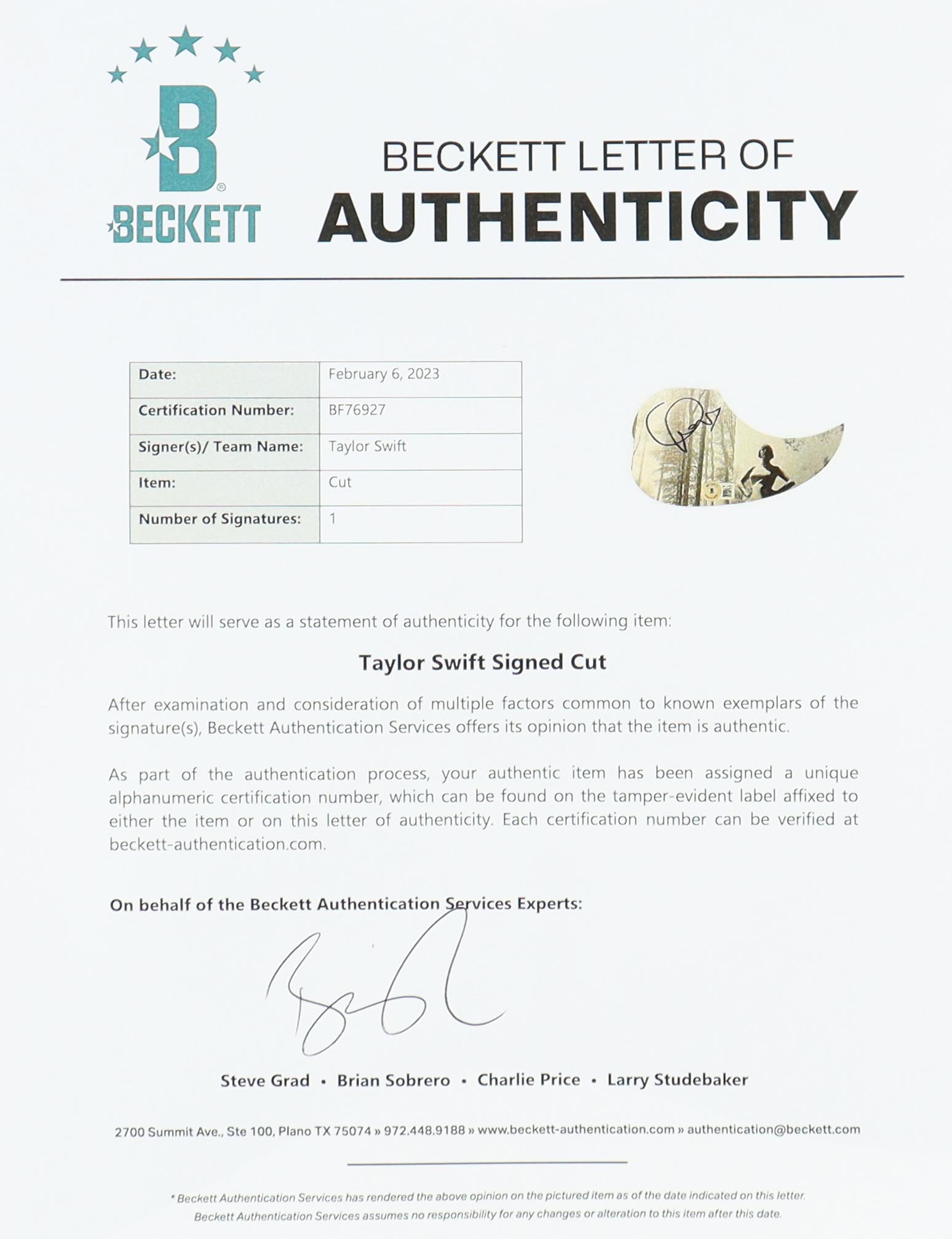 Acoustic guitar measures 39" in length and has been hand-signed on the pickguard by Taylor Swift. Please note the bottom of the guitar is heavily damaged, see photos for details.