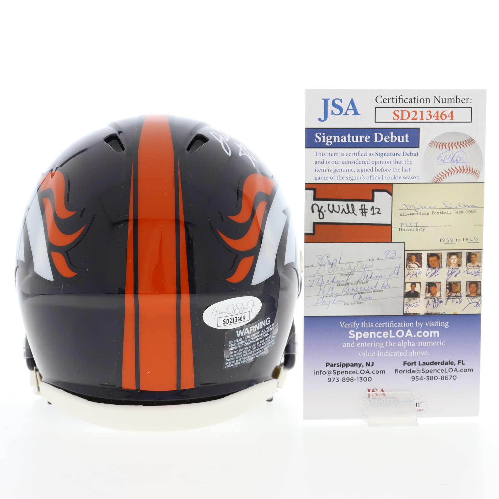 The autograph(s) includes an official James Spence Authentication (JSA) "Signature Debut" hologram and COA. "Signature Debut" is the autographed memorabilia equivalent to a rookie card. The JSA definition of a "Signature Debut" is as follows: "Any item that is autographed and received by JSA prior to the last game of the signer's official rookie season.