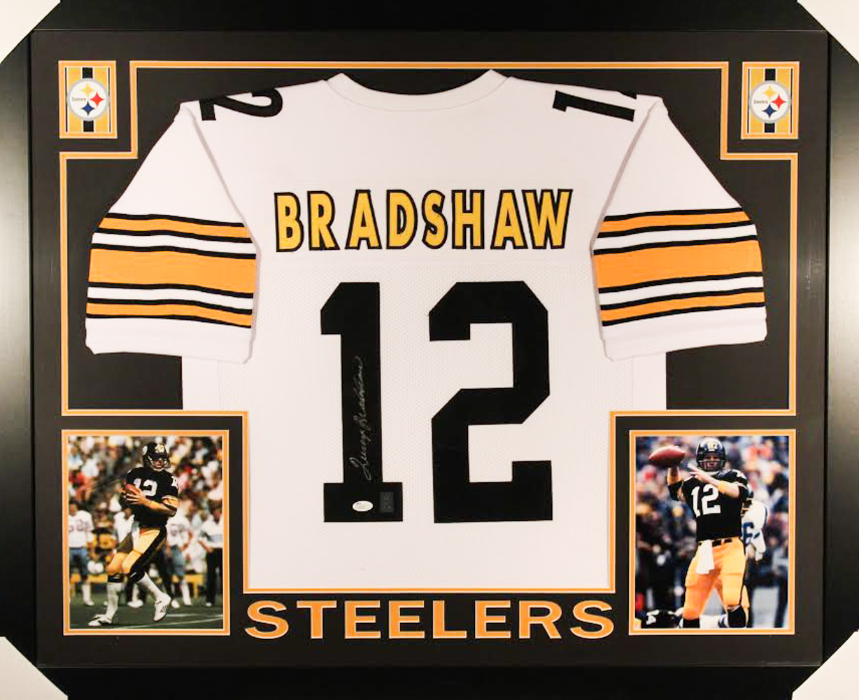 Custom framed display measures 35" x 43" in size. Features a jersey which has been hand-signed in silver paint pen by Terry Bradshaw (HOF).