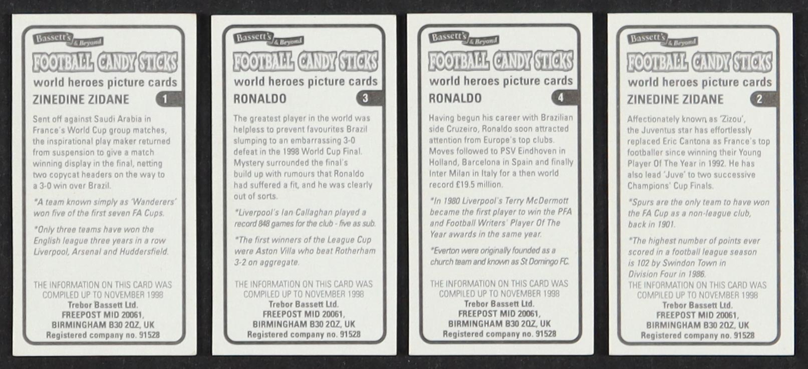 1999 Bassett's Football Candy Sticks World Heroes Complete Set of (50) Cards with Zinedine Zidane #1, Ronaldo #3, Ronald #4, Zinedine Zidane #2