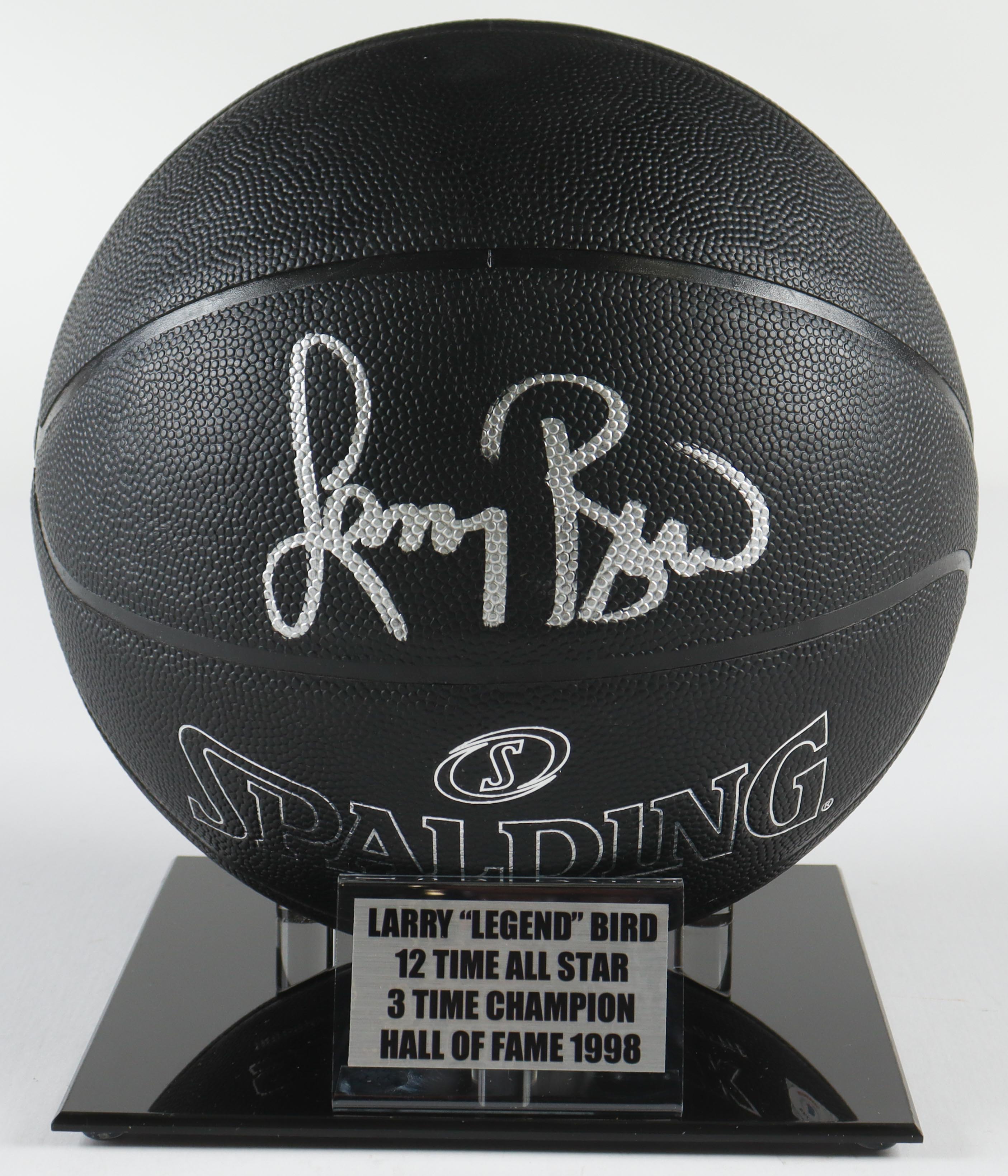 Larry Bird Signed Spalding Black Basketball with New Acrylic Basketball Display Stand with Name Plate (Beckett)