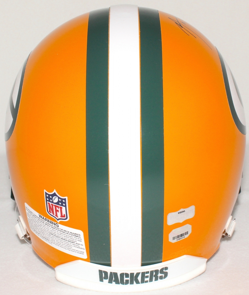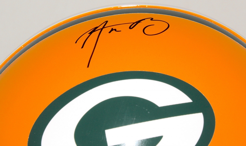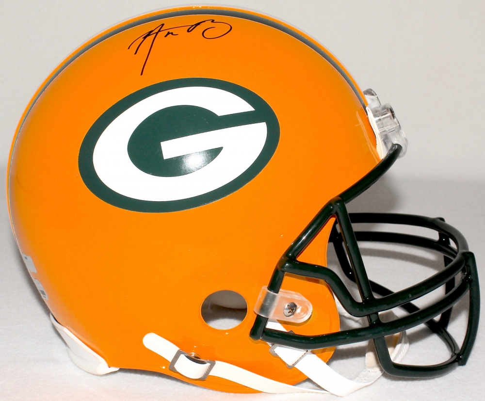 Green Bay Packers full size authentic pro-line helmet. Hand-signed in black felt-tip pen by Aaron Rodgers.