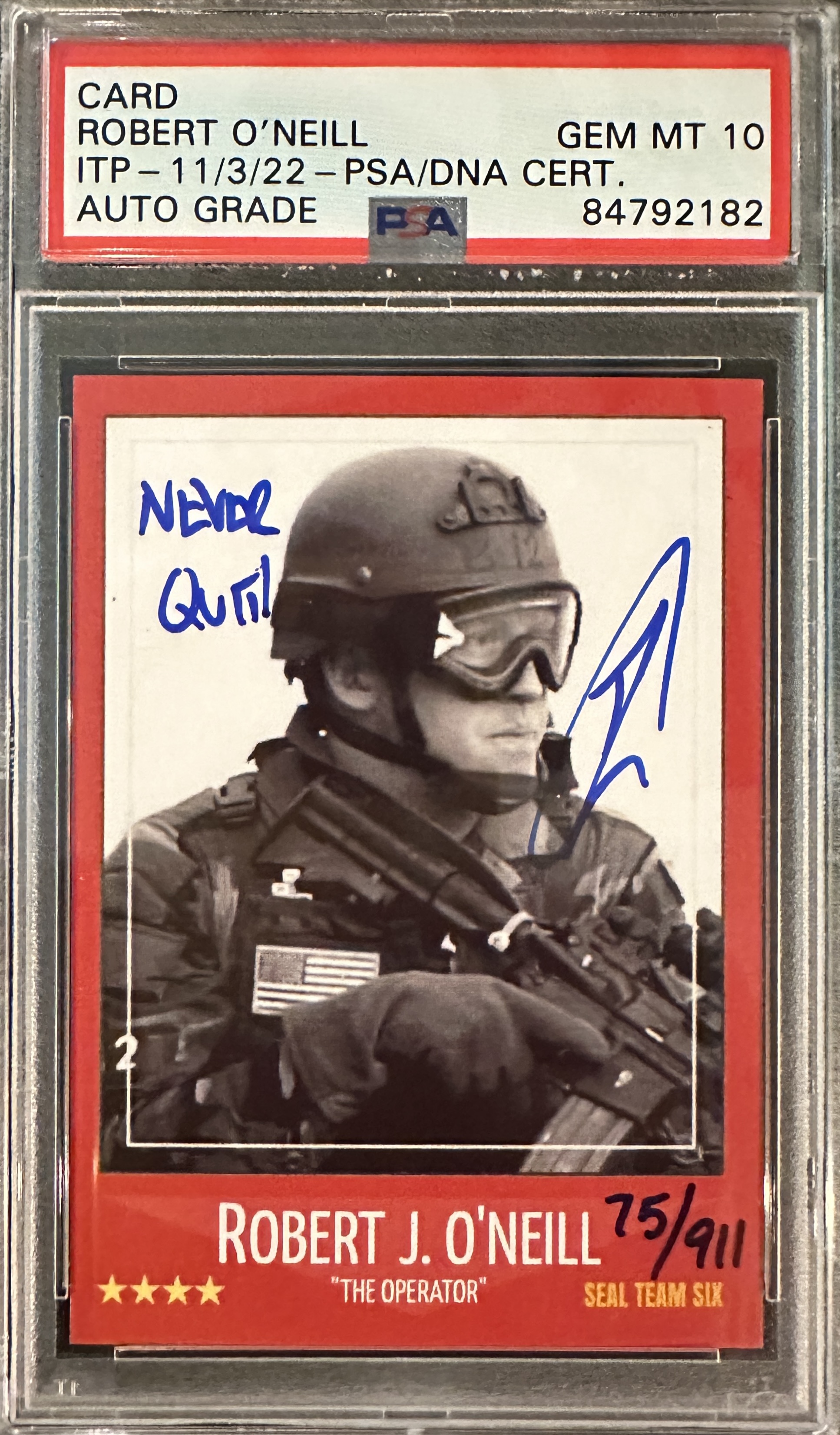 U.S. Navy SEAL Robert O'Neill Signed LE/911 "Bin Laden Raid" Card Inscribed "Never Quit!" (PSA 10)