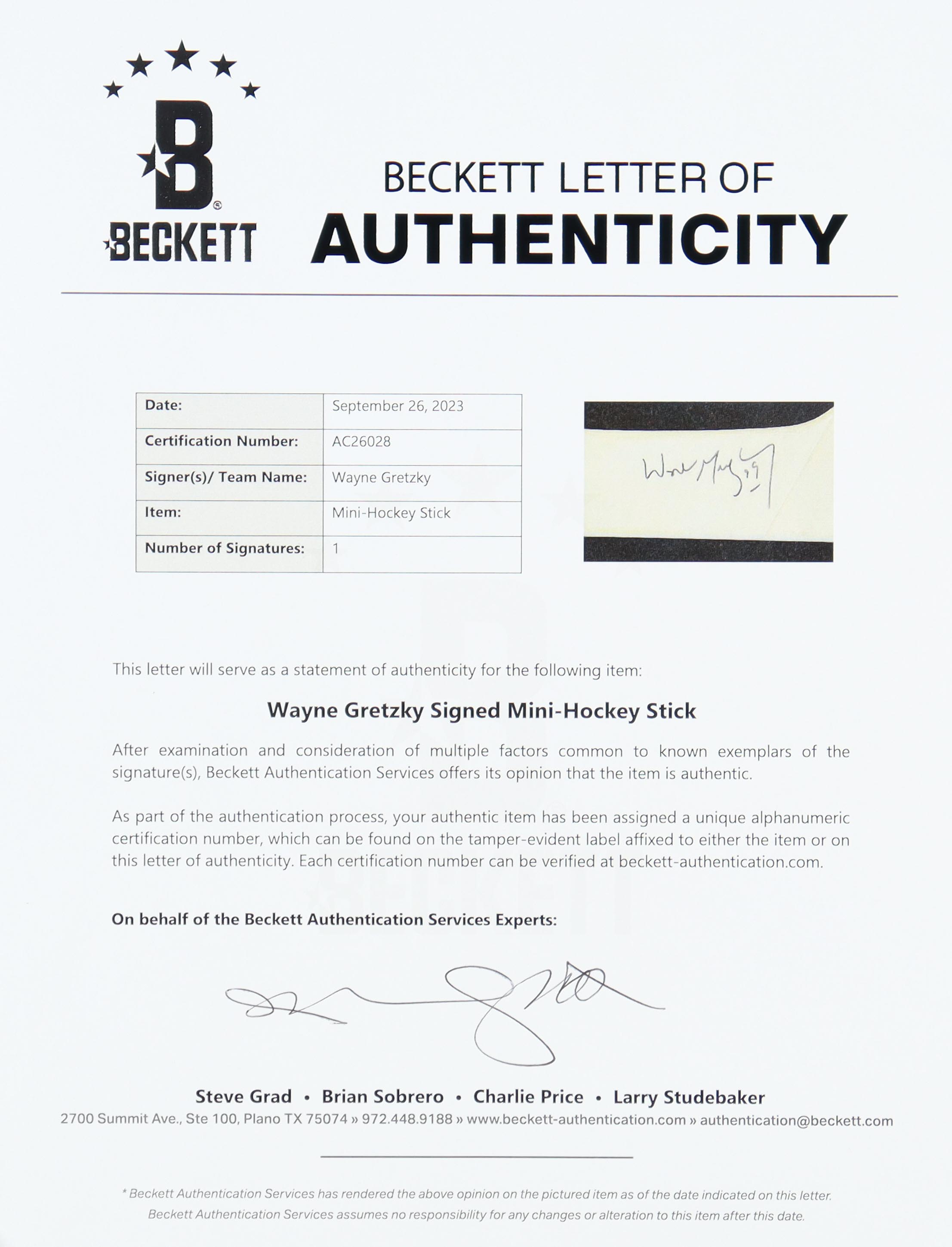 The autograph includes an official Beckett Authentication Services hologram and matching LOA for authenticity purposes.