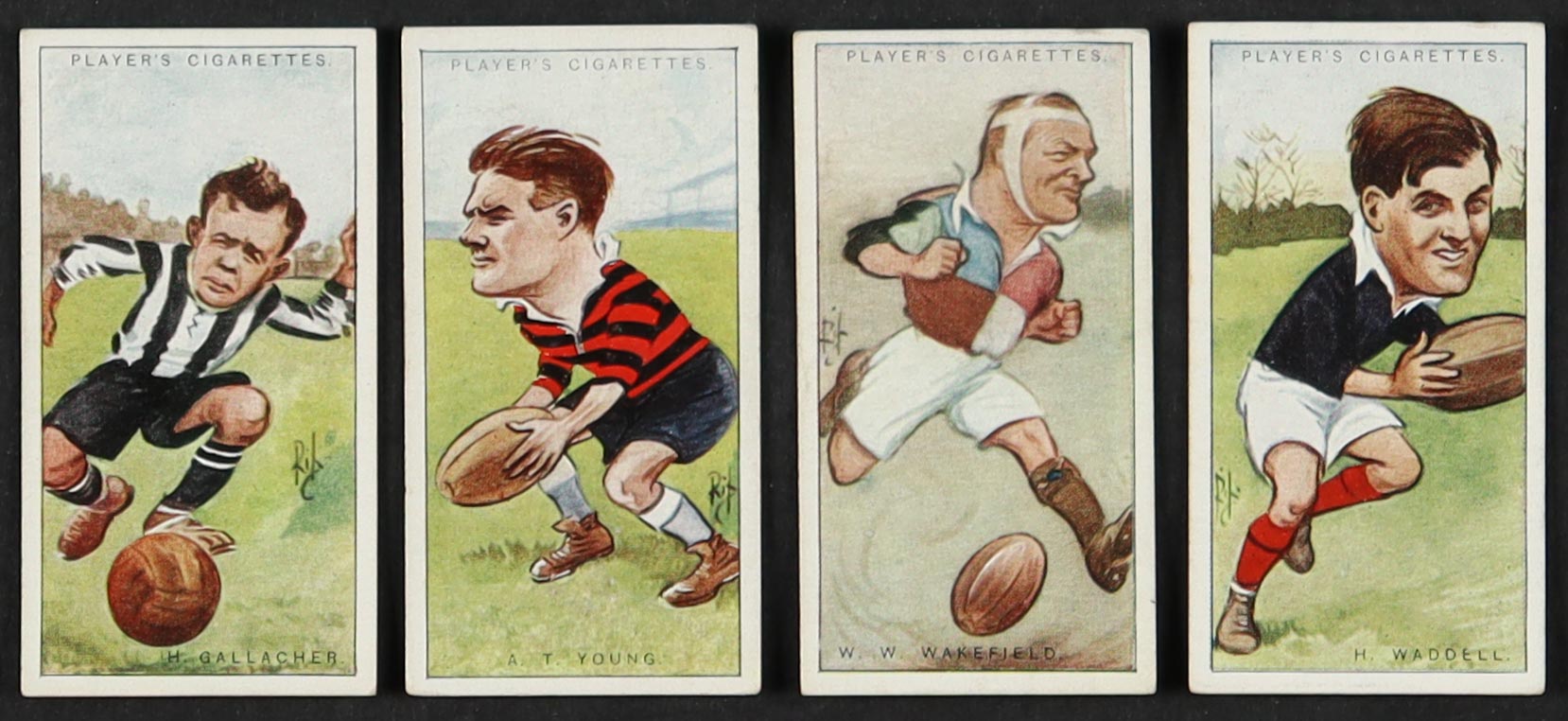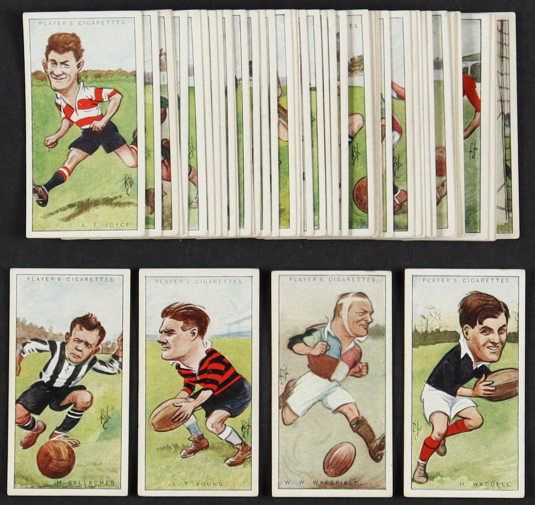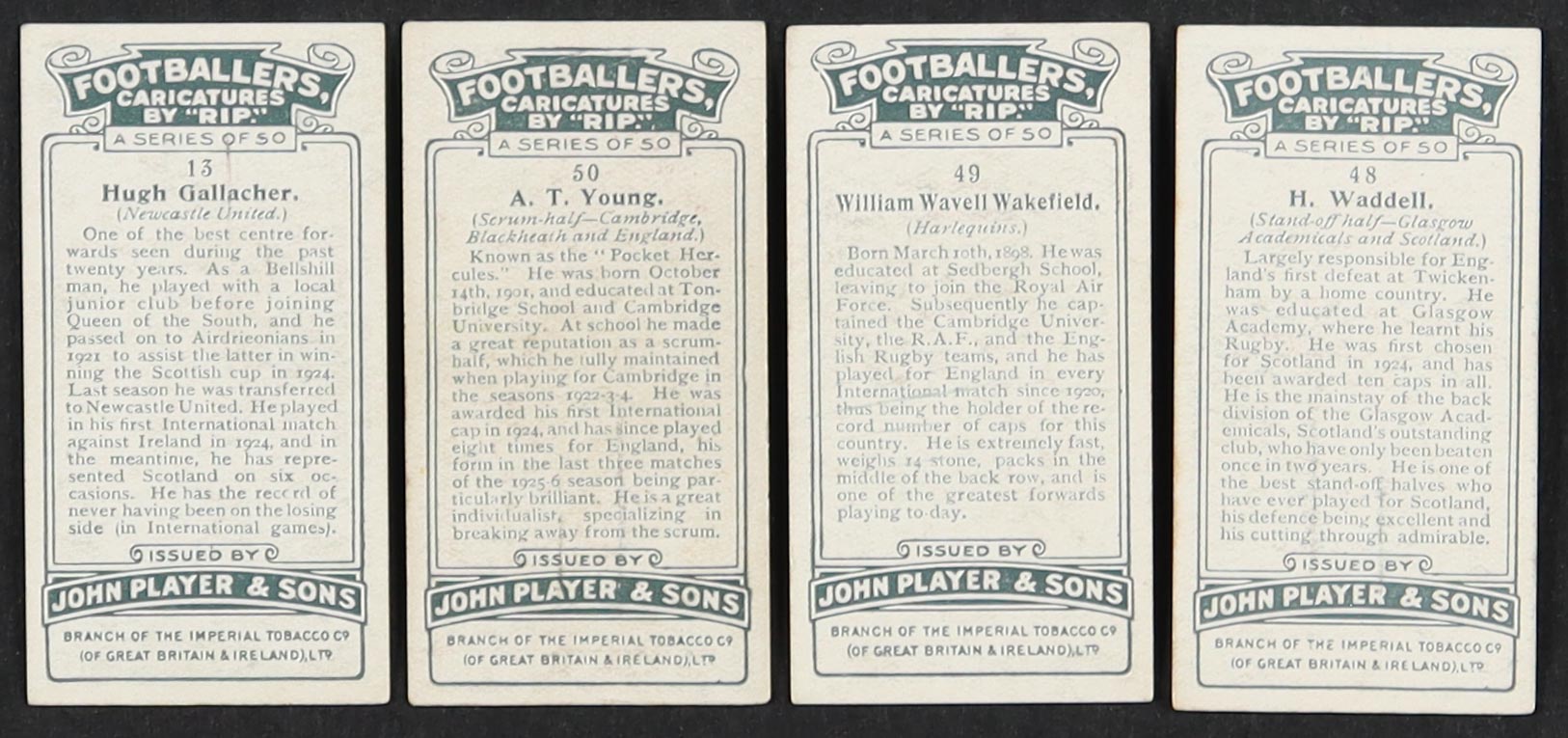 1926 Player's Footballers Caricatures by RIP Complete Set of (50) Cigarette Cards with Hugh Gallacher #13, A.T. Young #50, William Wavell Wakefield #49, H. Waddell #48